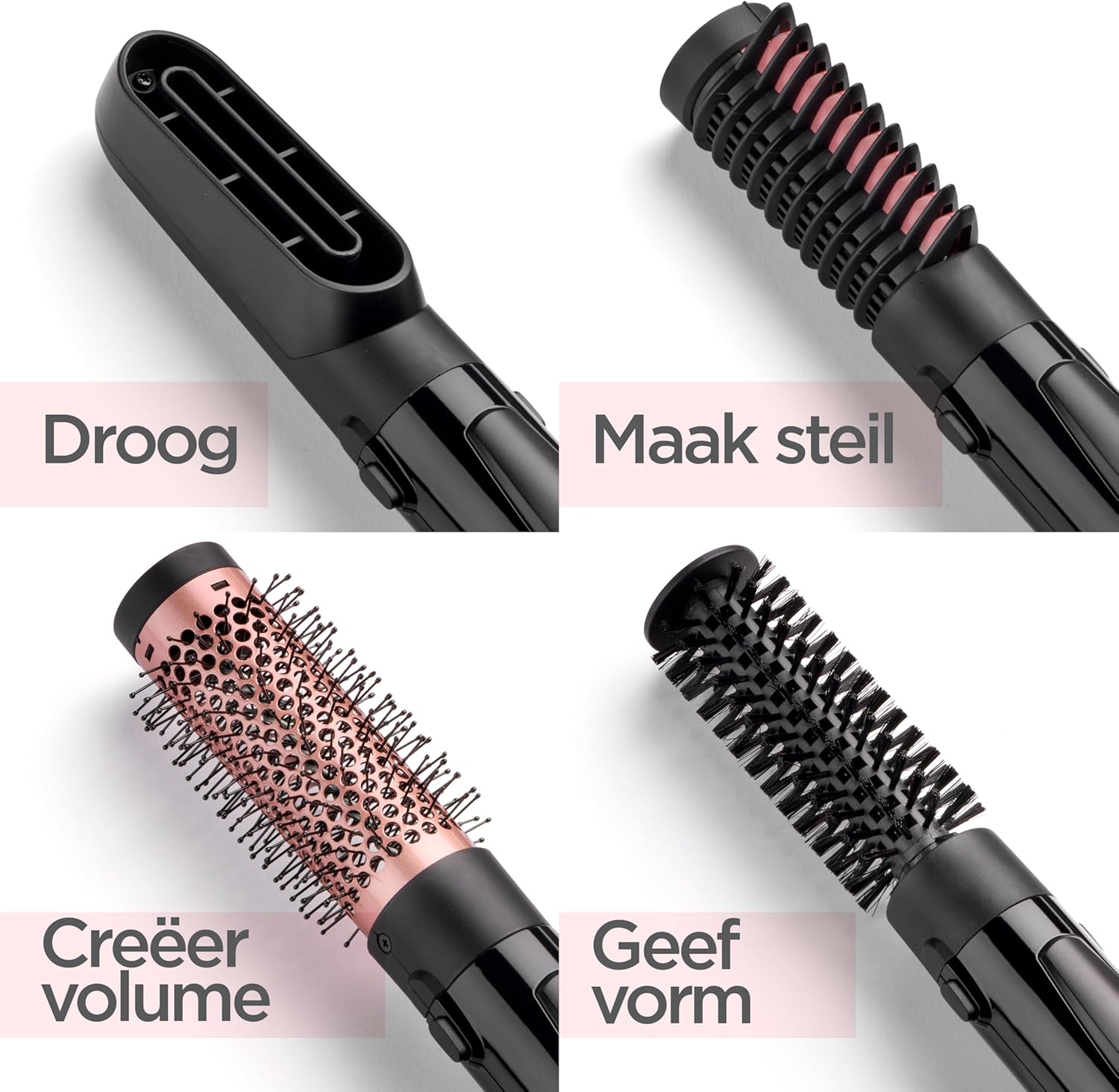 4-IN-1 STYLING TOOL — Inclusief een 38mm volumeborstel, een gladmakende borstel, een 20mm borstel voor kort haar & pony’s, en een blaasmond voor veelzijdige styling.