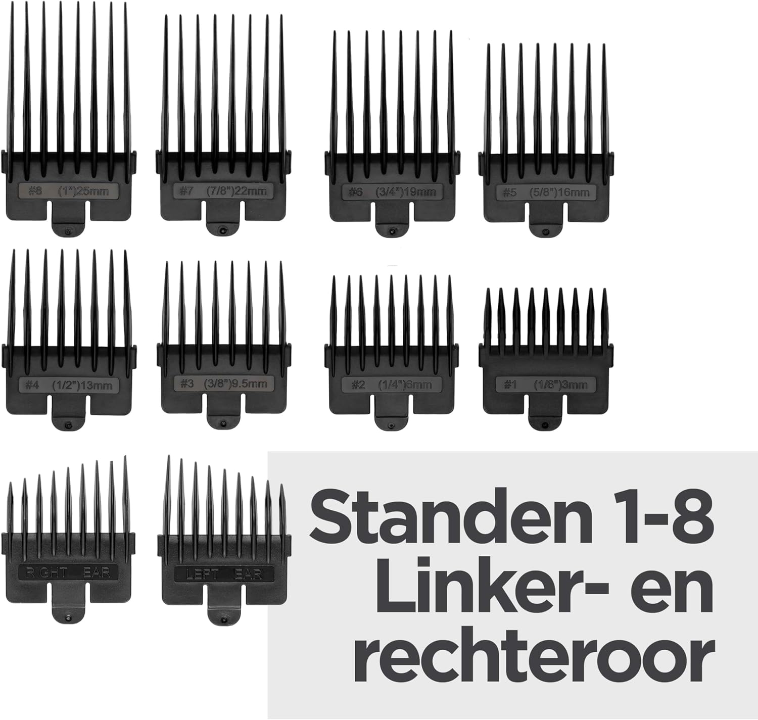 Inclusief 8 kamgeleiders; maten 1-8 voor snijlengtes (0,8 – 25 mm) en linker- en rechteroortapergids. De taper control zorgt voor een fijne afstelling voor nog nauwkeuriger knippen van haar.