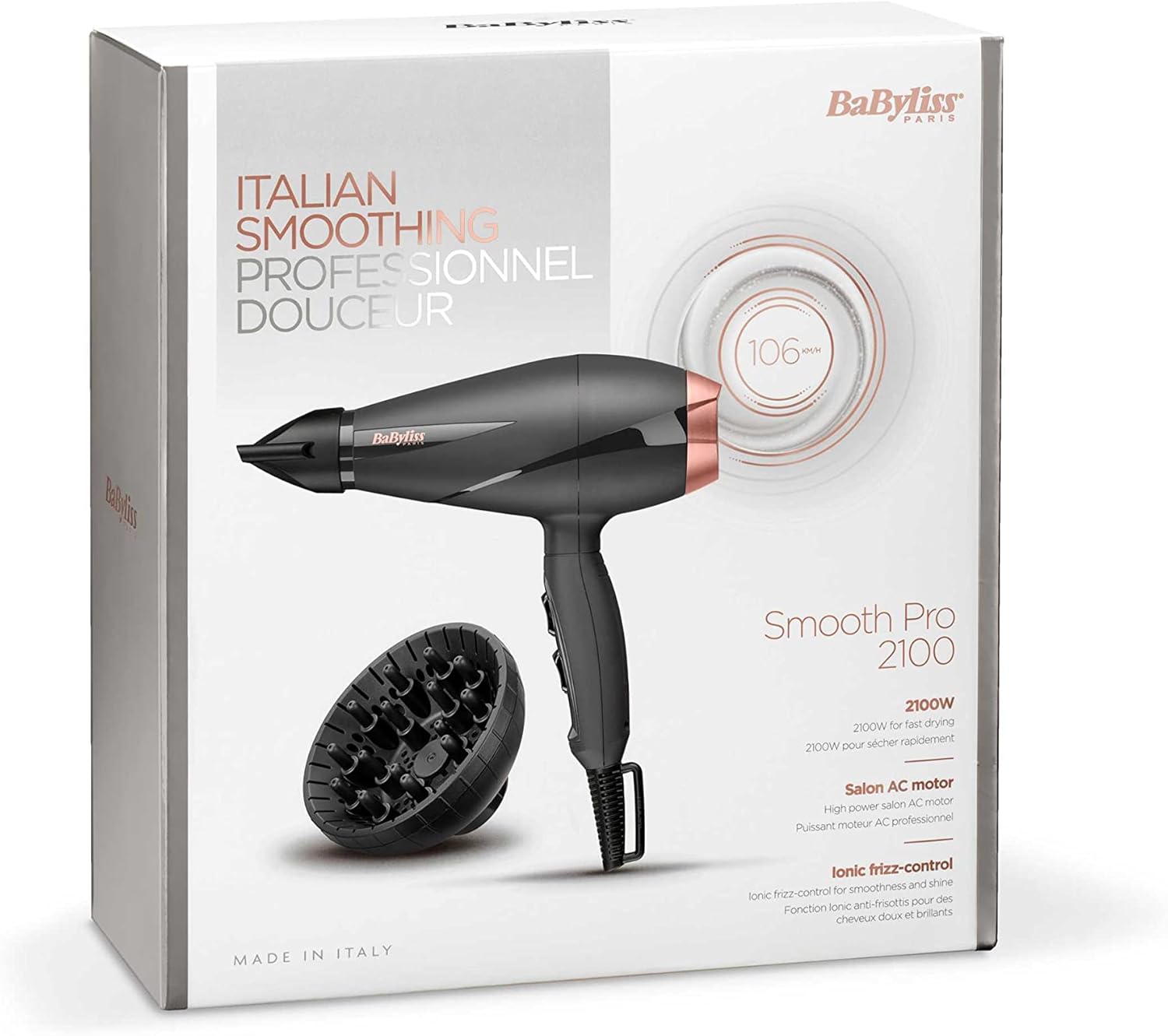 BaByliss Smooth Pro Haardroger & Diffuser – Krachtige 2100W Föhn, Gemaakt in Italië, Ionische Anti-Pluis Technologie, 3 Warmte- & 2 Snelheidsinstellingen, Zwart, 6709DE