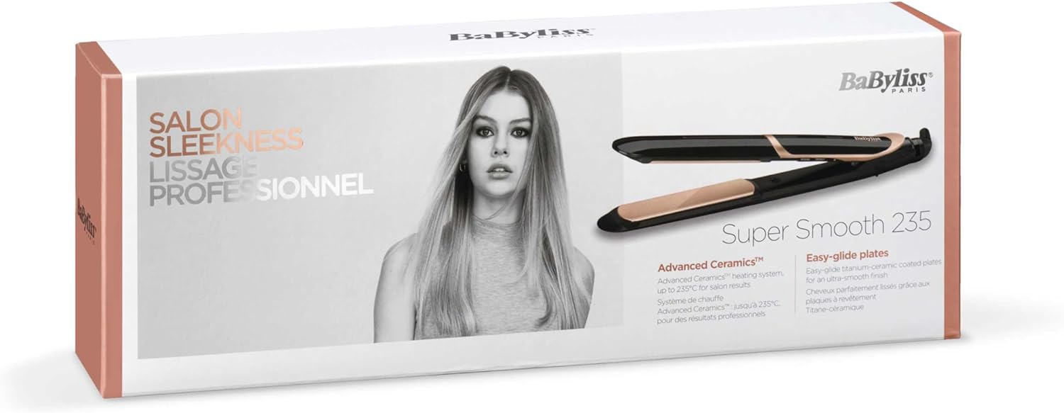 BaByliss Super Smooth Stijltang – Ionische Pluisvrije Technologie, Inclusief Hittebestendige Mat, Geavanceerde Keramische Platen voor Glad Stylen, Snelle Opwarming, 6 Temperatuurinstellingen 140°C tot 235°C, ST393E