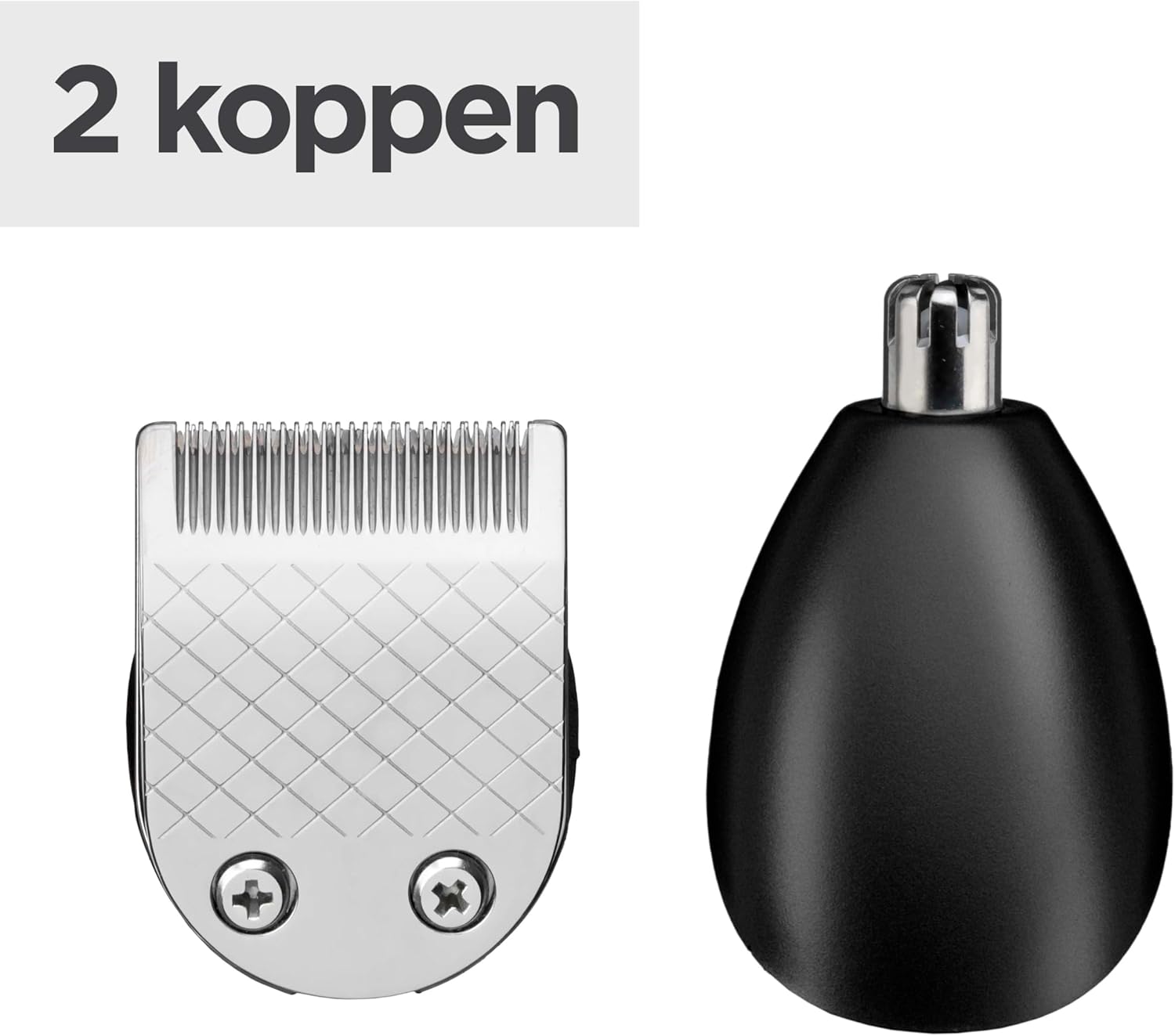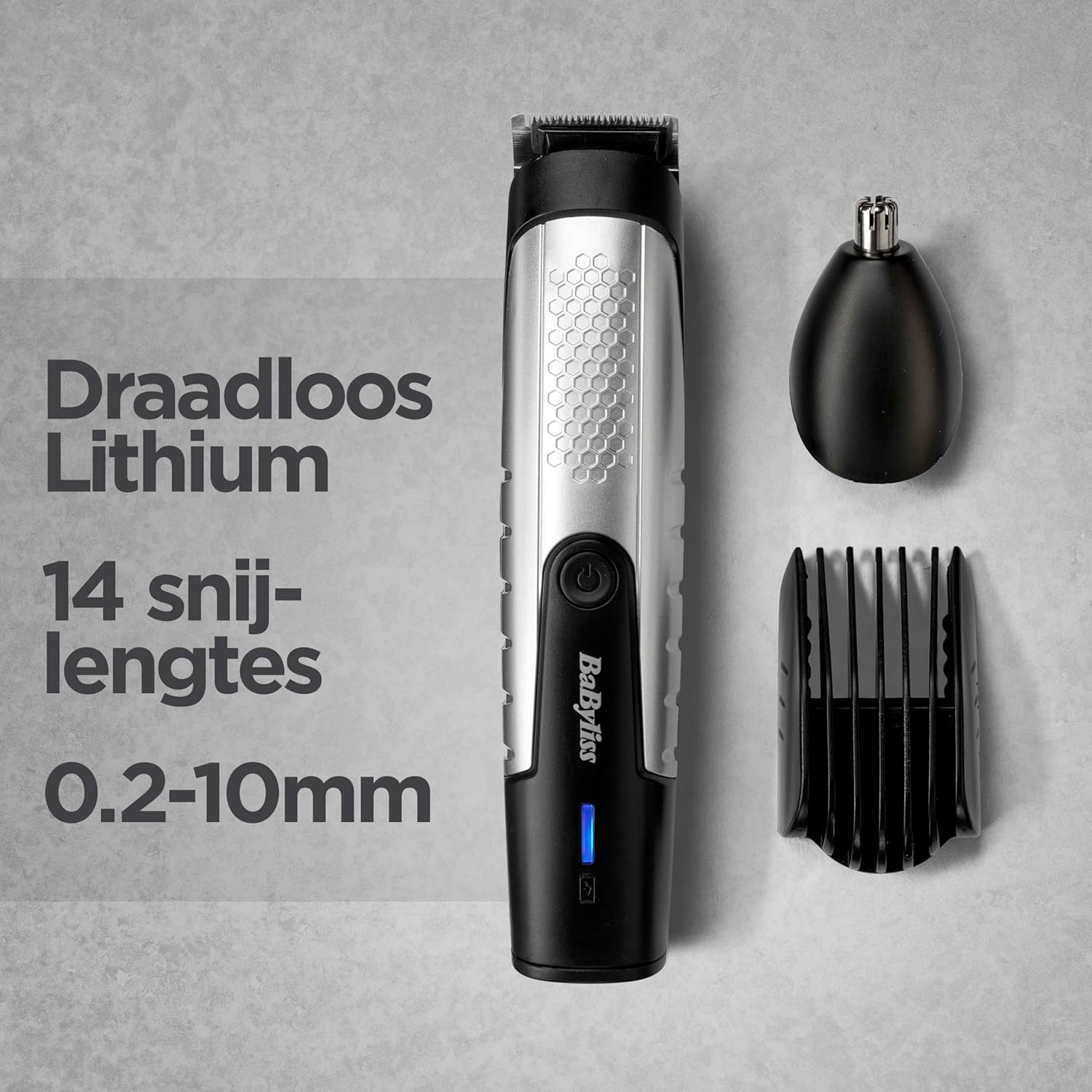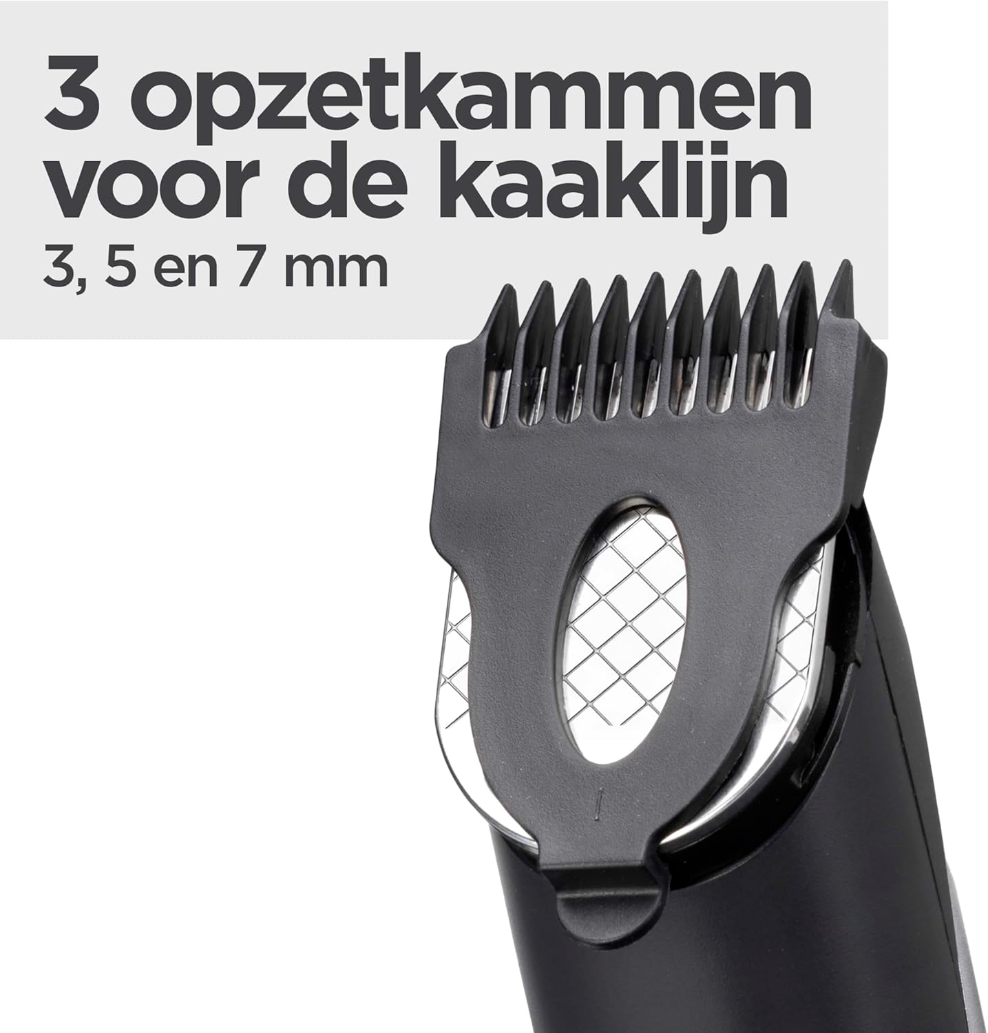 Veelzijdigheid van opzetkammen en accessoires: 1 x 5-voudig verstelbare baardkam (2, 4, 6, 8, 10 mm), 5 x korte baardkammen (0,0, 0,2, 0,4, 0,6, 0,8 mm) en 3 x opzetkammen voor kaaklijn (3, 5, 7 mm), neus- en oortrimmer en opbergtas.