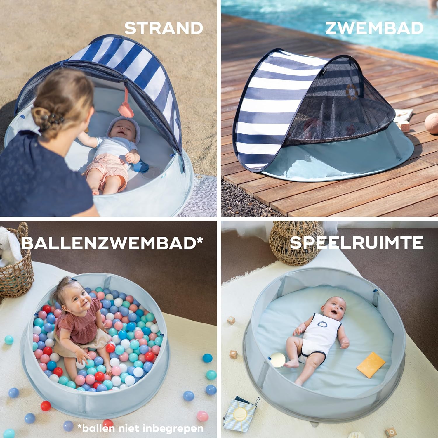 3-IN-1: de Aquani is een speelruimte, een extra bedje en een zwembadje. Deze beschermt, vermaakt en verfrist uw baby, waar u ook bent.