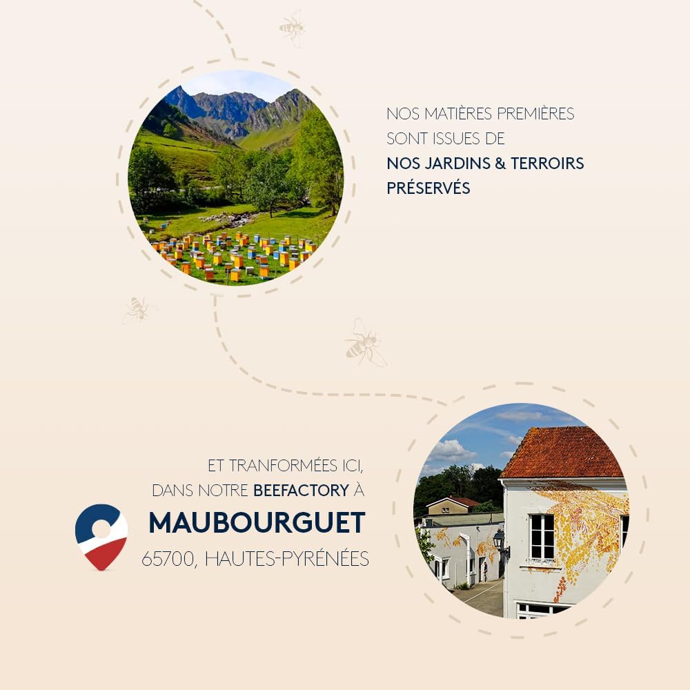 100% biologisch, planten en honing uit onze tuinen en bijenstallen: gecertificeerd door COSMEBIO, de ingrediënten zijn biologisch, zonder conserveermiddelen, geurstoffen of etherische oliën (bevat alcohol). Ze komen uit onze bijenstallen en tuinen in onze eco-plaats in de Pyreneeën.