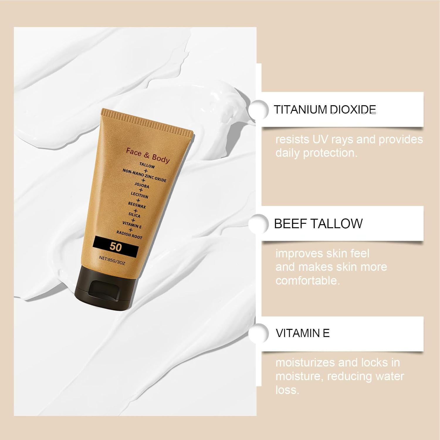 Nourishing Beef Tallow Ingredients: Infused with beef tallow, this sunscreen is packed with natural nutrients, including and fatty acids, to nourish and hydrate your skin while providing long-lasting sun protection