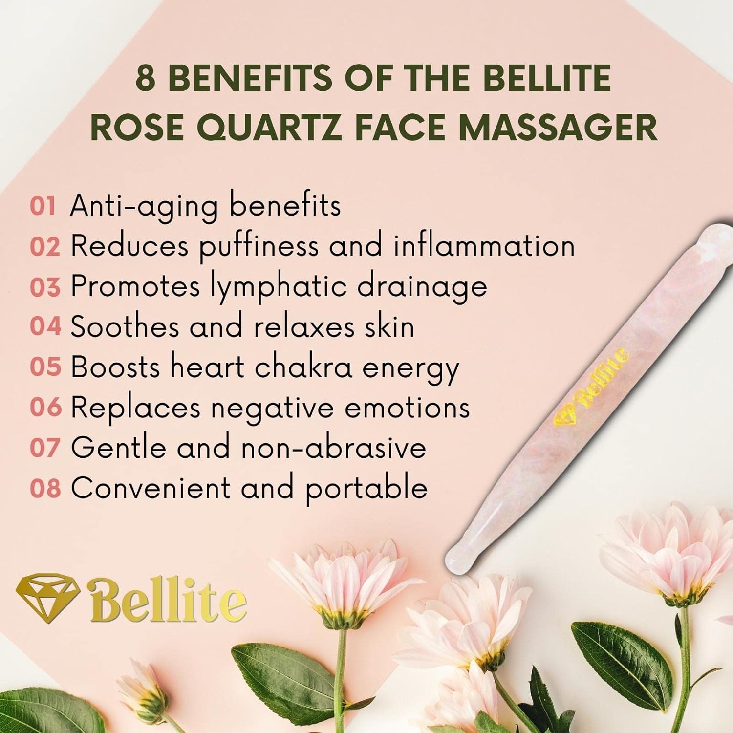 Van het rozenkwarts materiaal dat wordt gebruikt in de Bellite Crystal Reflexology Face Massager is aangetoond dat het een reeks voordelen biedt voor de huid en het algehele welzijn. Het stimuleert de bloedsomloop, bevordert de lymfedrainage en helpt wallen, fijne lijntjes en rimpels te verminderen.