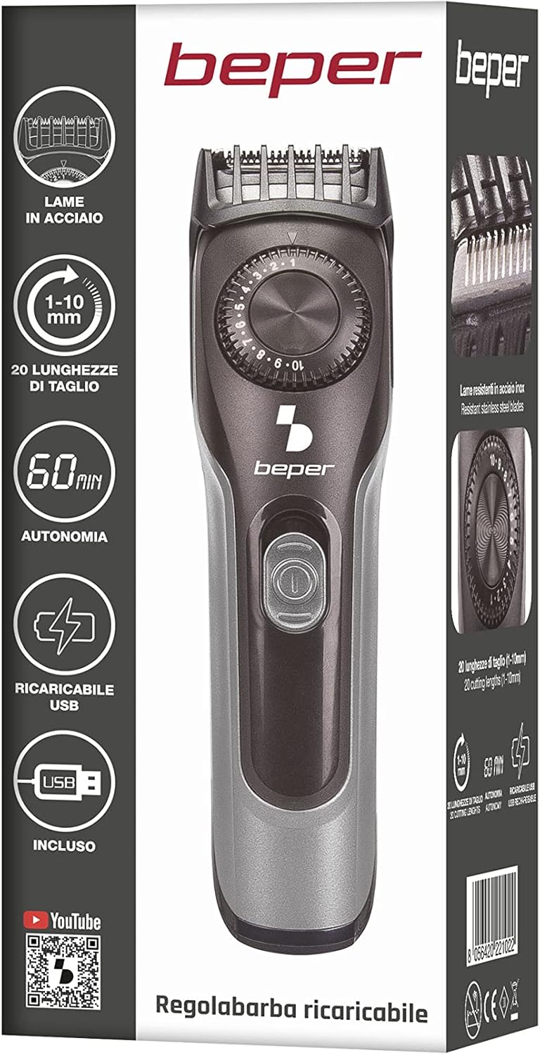 Beper 40.332 – Oplaadbare baardtrimmer, ook geschikt voor haar, verwijderbare roestvrijstalen messen, 20 lengtes, opladen met USB-kabel (muuradapter niet inbegrepen)