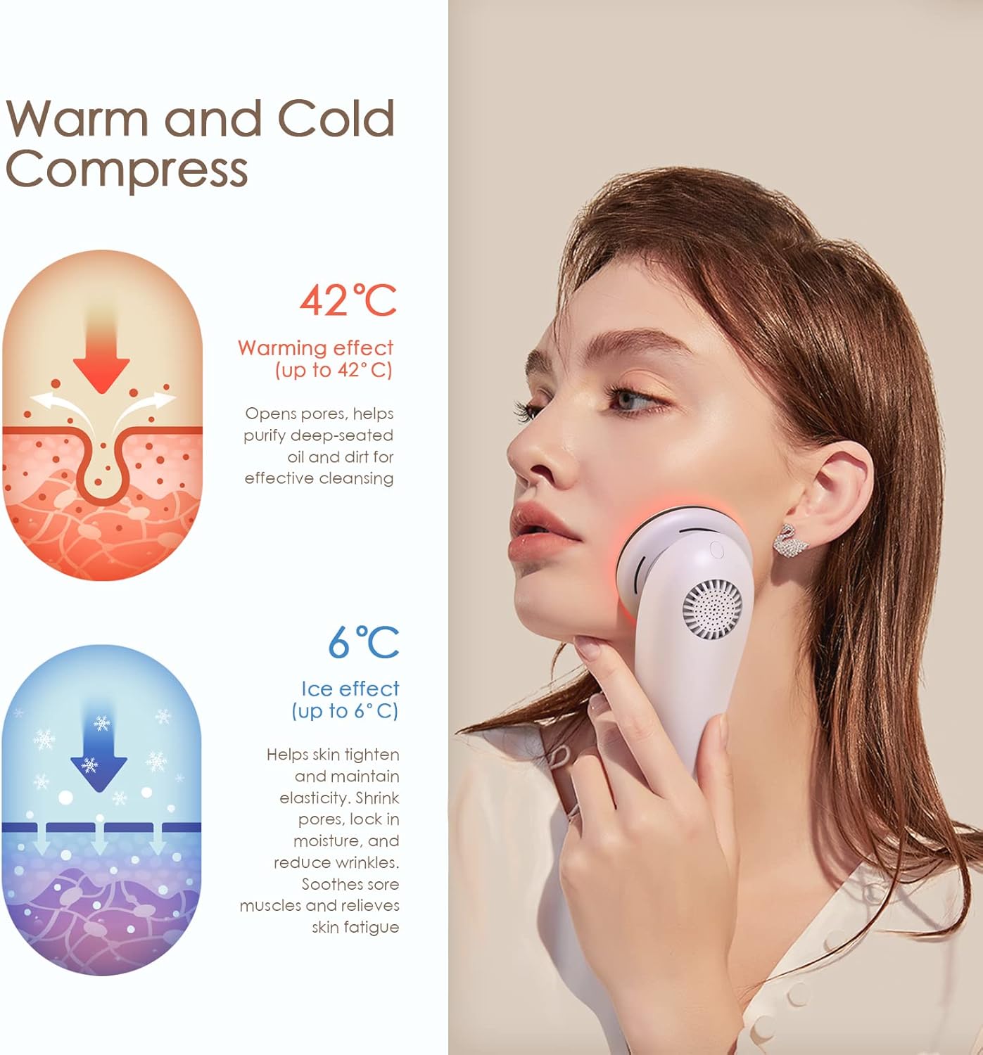 ☻Warm en koud gebruik, snel omschakelen: ons schoonheidsapparaat reinigt, kalmeert en reinigt de huid diep. Verwarming tot 42 °C opent de poriën en helpt om de diepe lagen olie en vuil te reinigen voor een effectieve reiniging. 6 °C ijskompres krimpt snel de poriën, houdt huidvocht in, helpt de huid te kalmeren en omvat de gezichtsessentie/lotion in de poriën.