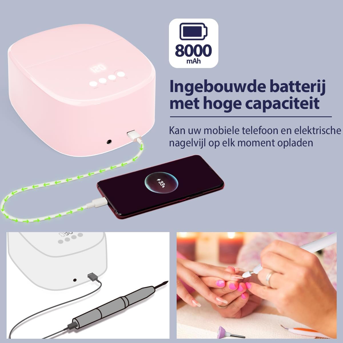【USB port for charging】This cordless LED nail lamp has a USB interface that can charge the nail drill and mobile phone while doing nail art. It is a professional cordless led nail lamp specially designed for nail art.