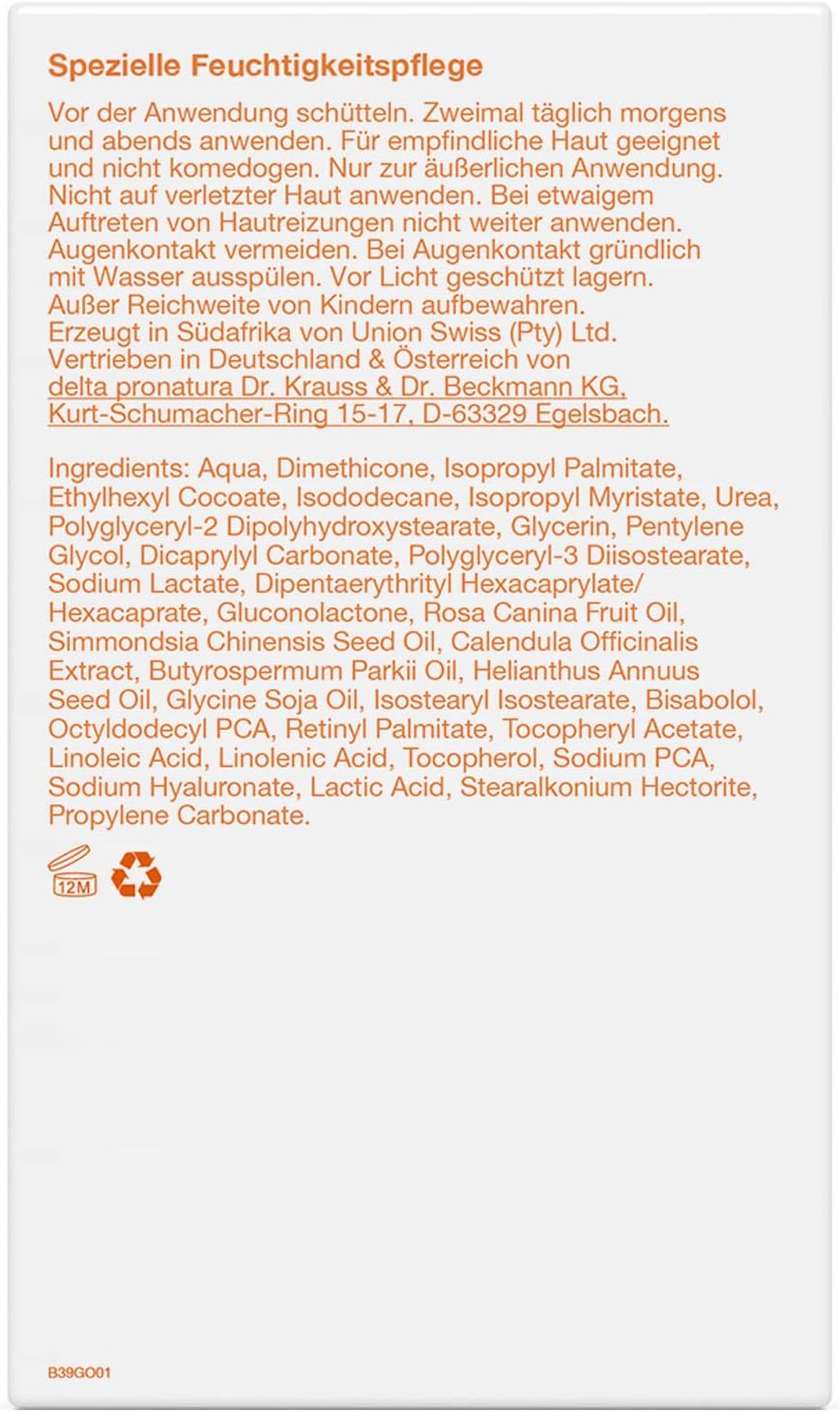De 2-fasen-formule van 43% oliën en lipiden en lotion met 5% ureum hydrateert dagelijks intensief en verzorging, zelfs voor droge en gevoelige huidtypes. Hij is ultralicht, trekt snel in, zonder te vetten en zorgt voor een merkbaar soepele en mooie, gezond uitziende huid. tweemaal daags ‘s ochtends en ‘s avonds aanbrengen voor een extra langdurige hydratatie. Voor optimaal gebruik schudden. 2 x hoger olie- en lichaamsbotergehalte in vergelijking met andere lichaamsmelk, lichaamscrèmes en bodylotions 4 x hogere vochtvoorziening van de huid na 28 dagen in vergelijking met dag 1 vrij van kleur- en geurstoffen zonder conserveringsmiddelen veganistische verpakking recyclebaar