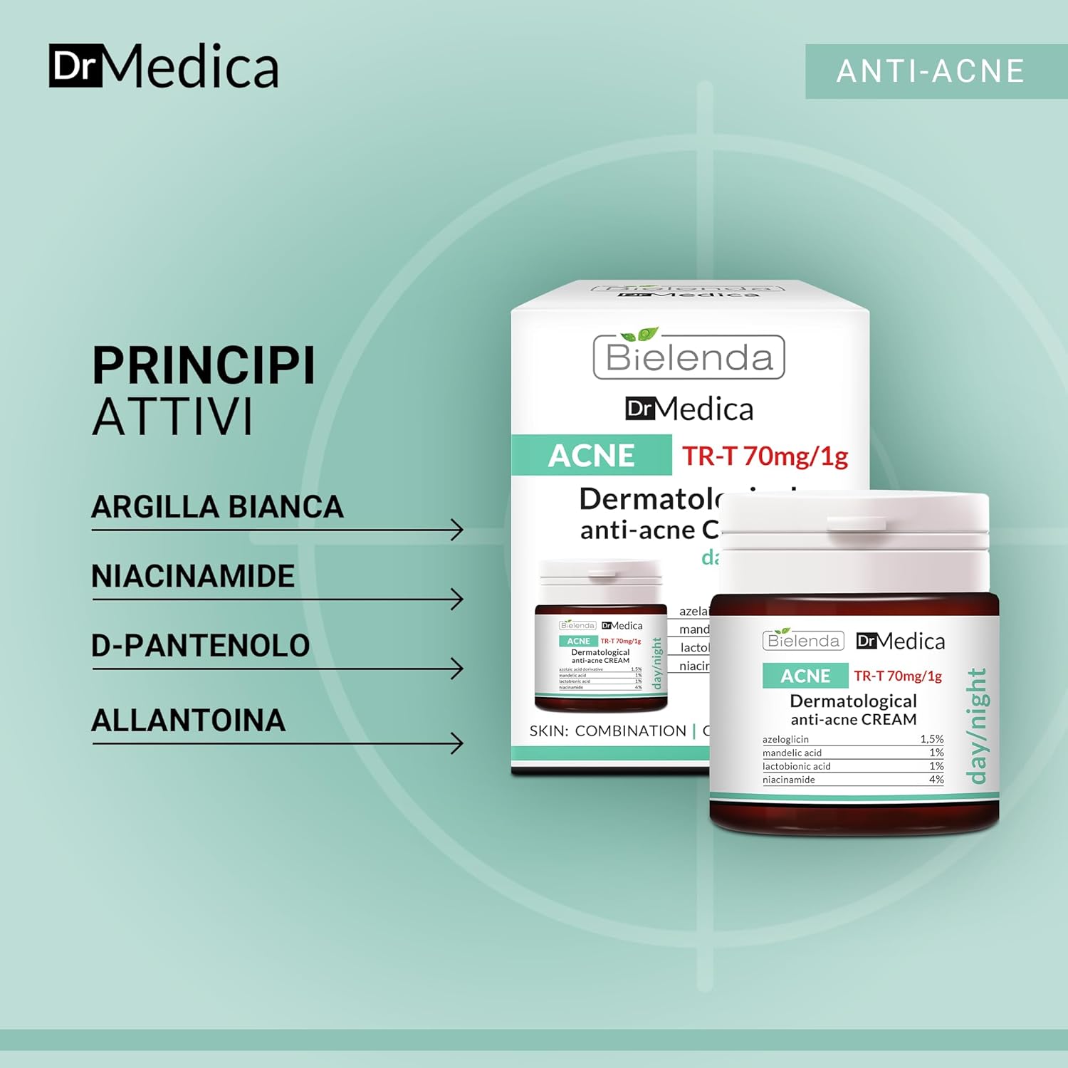 Dermatologische anti-acnecrème bevat een speciaal ontwikkelde formule T-TR 70mg/1g, samengesteld uit krachtige actieve ingrediënten gericht op directe werking op acnelaesies.