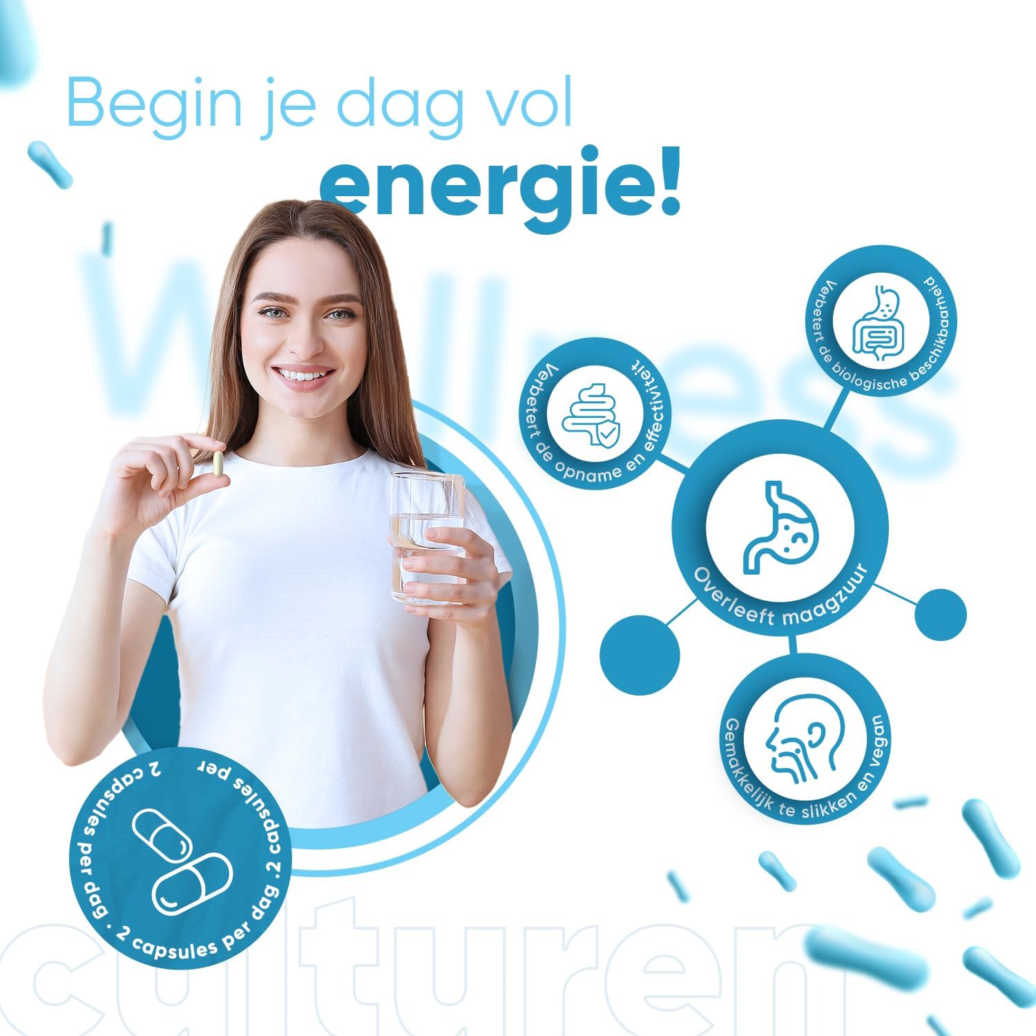 Bevat 20 verschillende goede bacteriestammen – Onze capsules bevatten in totaal 20 verschillende bacteriestammen, waaronder Bifidobacterium Breve, Bifidobacterium Longum, Lactobacillus Gasseri, Lactobacillus Acidophilus, Lactobacillus Bulgaricus, Lactobacillus Casei, Lactobacillus Reutri, Lactobacillus Rhamnosus evenals Streptococcus Thermophilus en Enterococcus Faecium.