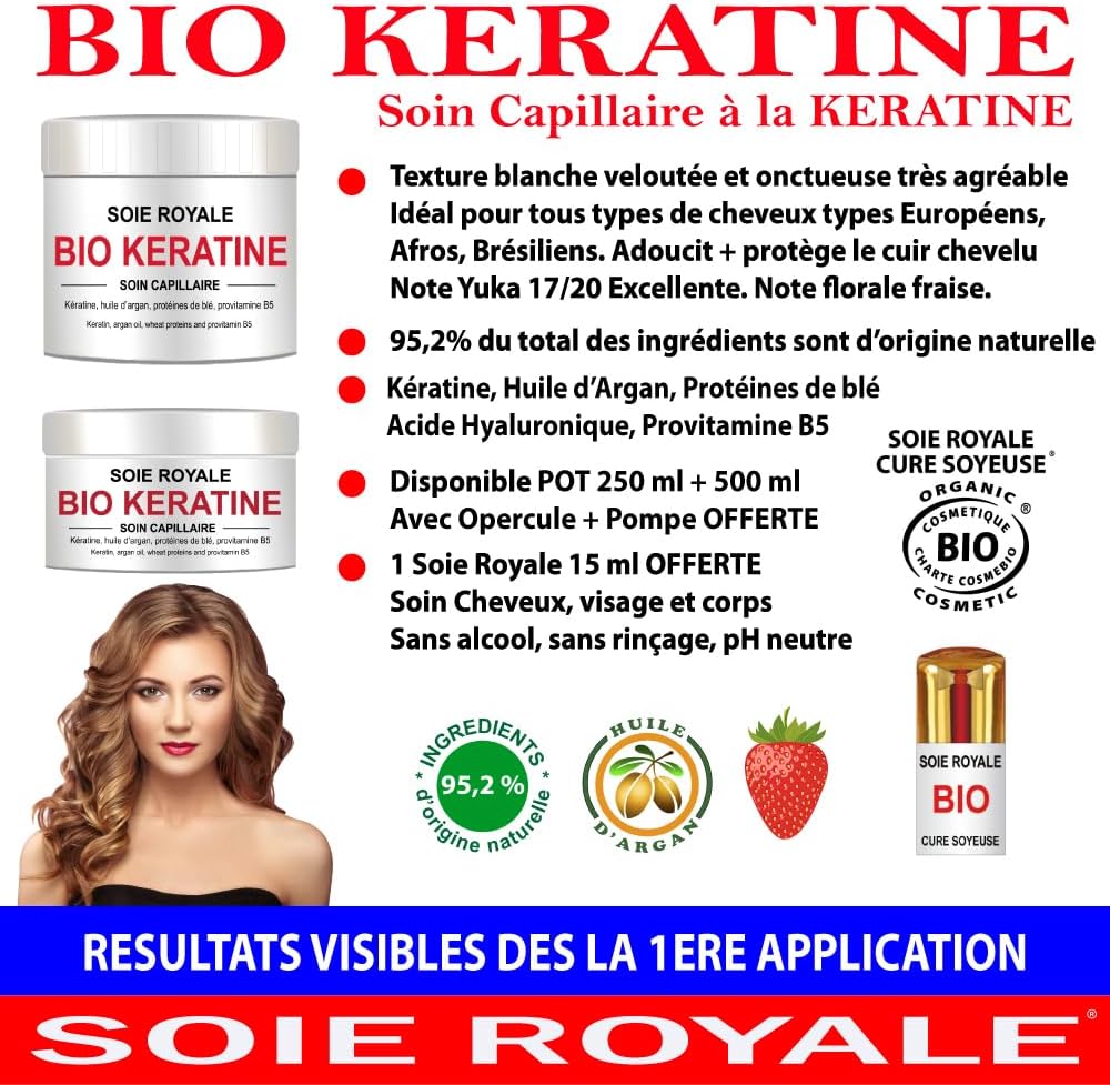 BIO Keratine Haarverzorging 500 ml Herstelt Hydrateert Voedt Ontwart Maakt alle haartypes glad Gratis 1 Serum Soie Royale Organic Silky Cure 15 ml