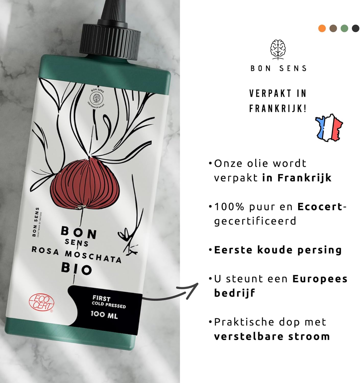 BIO Rozenbottelolie voor Gezicht en Huid – 100% Puur en Biologisch – Anti-Aging, Haar, Littekens en Striae Olie – Rijk aan Vitamine C, Omega 3, Vitamines E + A (Retinol) – 100ml