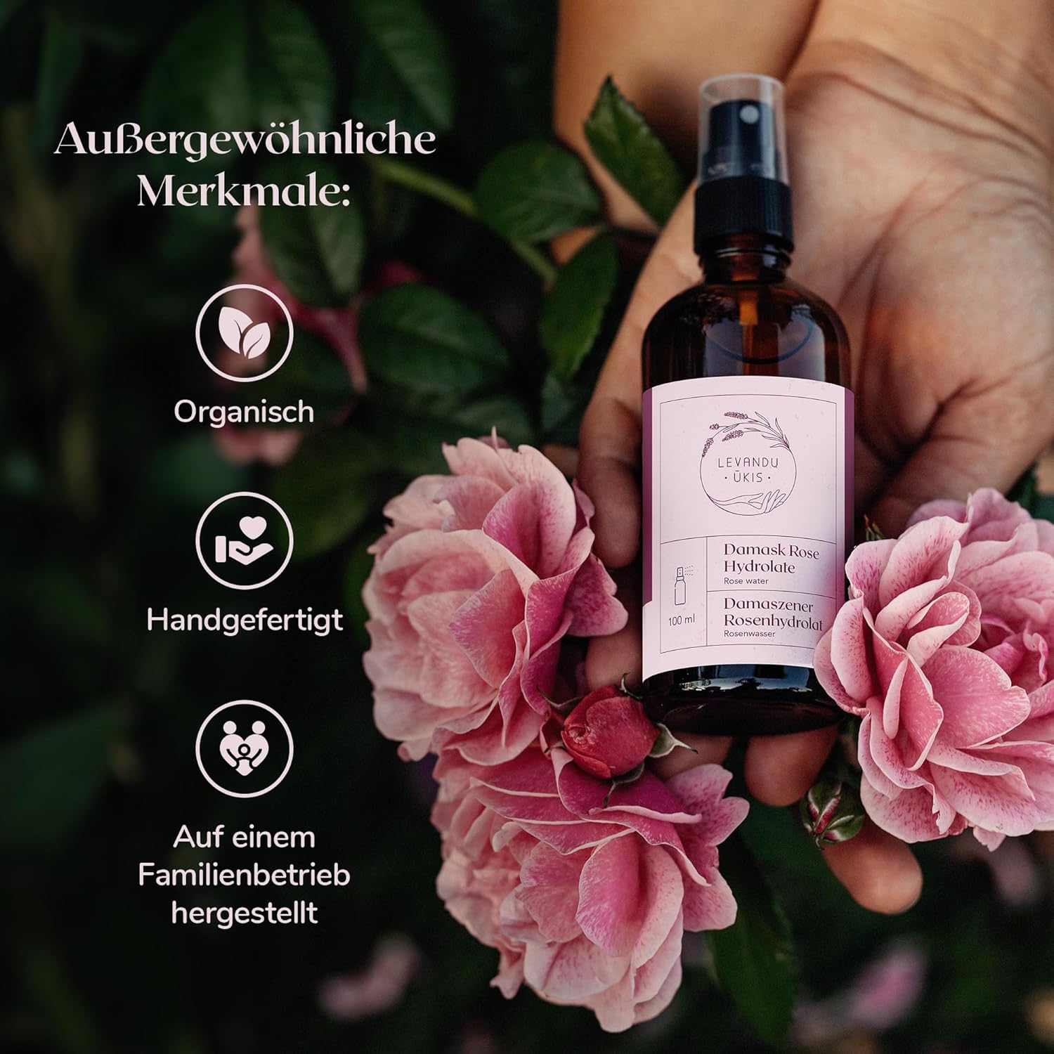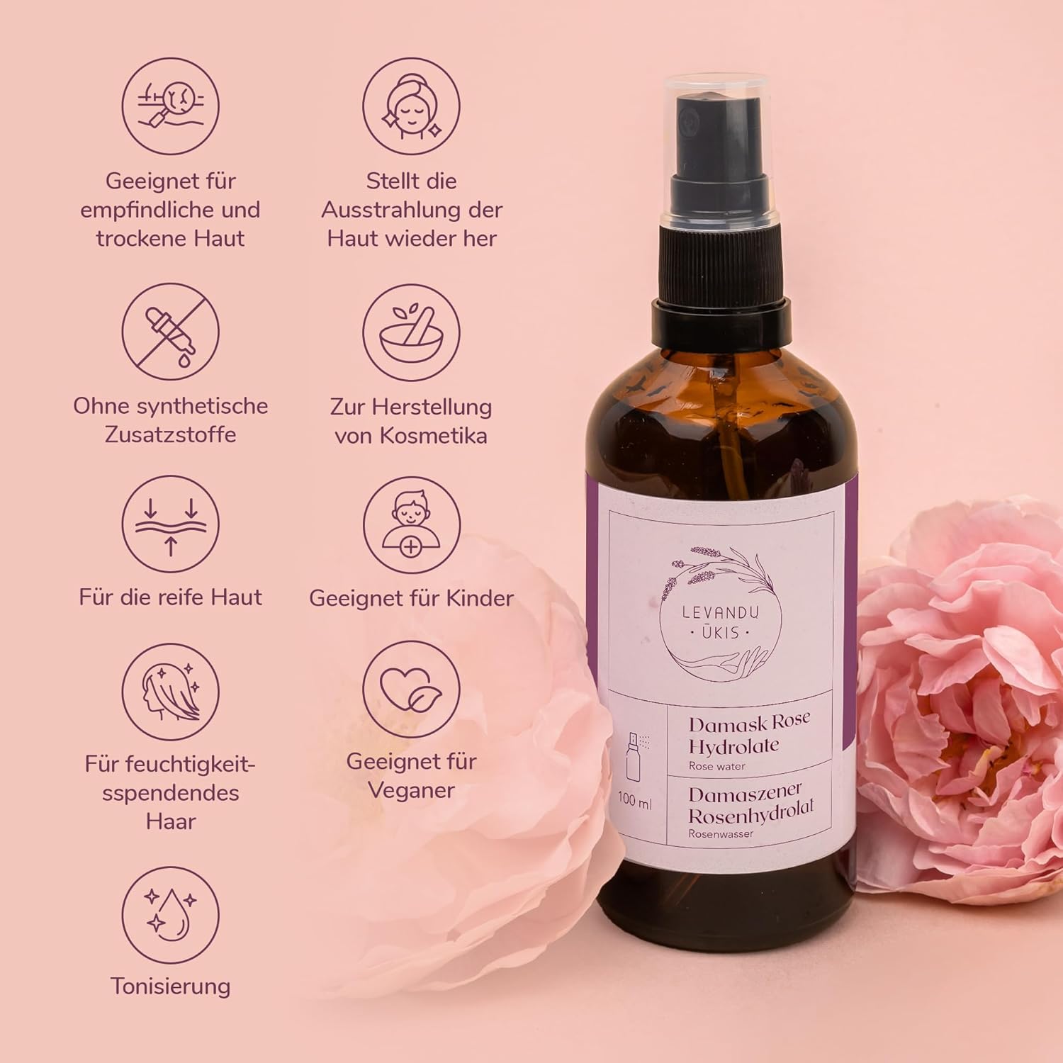 Bio Rozenwater, Damascus-rozenhydrolaat, 100% natuurlijk plantaardig water, verzorgingsspray voor gezicht, huid en haar, rozenhydrolaat als gezichts- en scheerwater, 100 ml – Levandu Ukis
