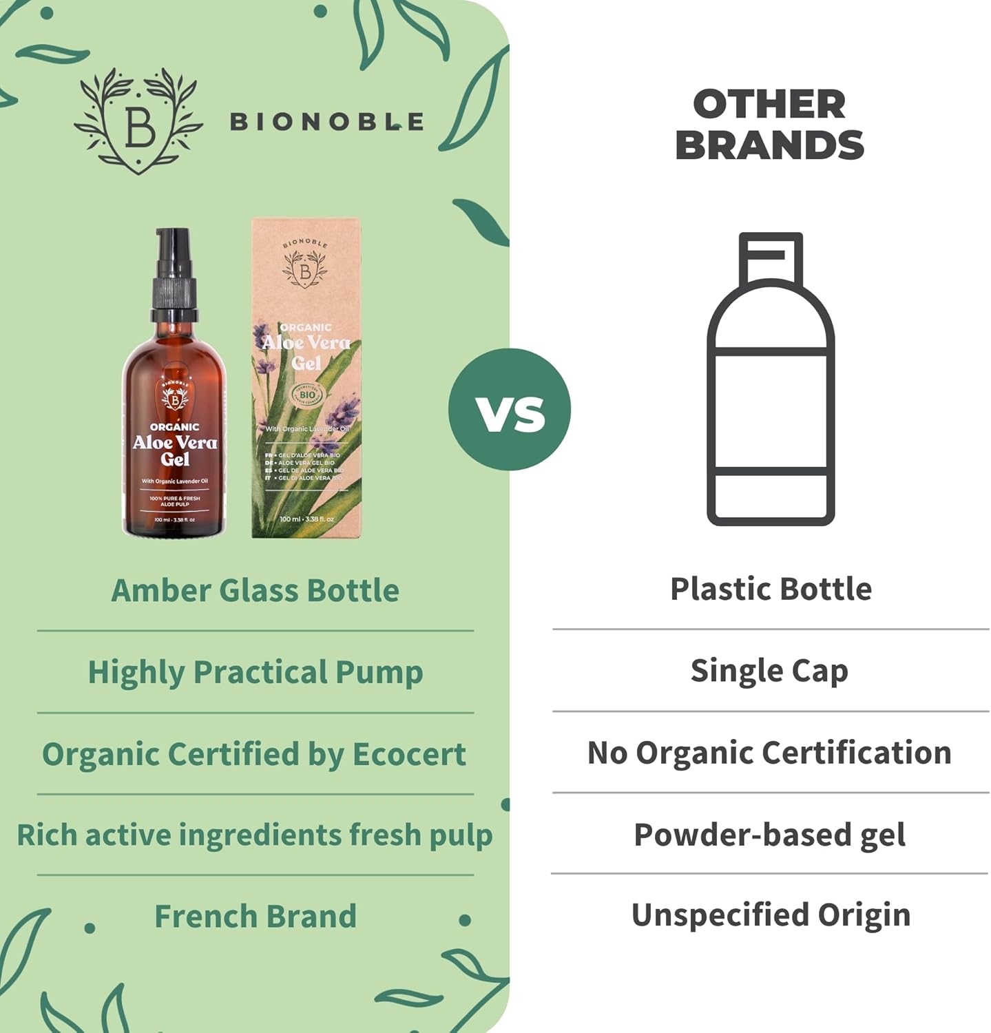 I recently purchased the Bionoble Organic Aloe Vera Gel, and I’m so impressed with its quality and versatility. This product is made with 100% pure fresh aloe pulp, and you can really tell the difference compared to other aloe vera gels I’ve tried. The texture is smooth, light, and absorbs quickly without feeling sticky or greasy, which makes it perfect for a variety of uses.I’ve been using it on my face, especially around the eye contour area, and it feels incredibly soothing. It helps calm irritation and provides excellent hydration without any harsh chemicals, which I love. I’ve also applied it to my body after sun exposure, and it really helps with skin recovery, leaving my skin feeling soft and refreshed.The addition of organic lavender is a nice touch—it gives a subtle, natural fragrance that adds to the overall calming effect. I also appreciate that it’s free from xanthan gum, making it a cleaner option for those with sensitive skin.The packaging is a huge bonus! The glass bottle feels luxurious, and the pump dispenser makes it easy to use without making a mess. It’s also more eco-friendly, which I always appreciate.Overall, I’m really happy with this aloe vera gel and will definitely be repurchasing. If you’re looking for a high-quality, organic aloe vera product that’s gentle on the skin and effective, I highly recommend this one!