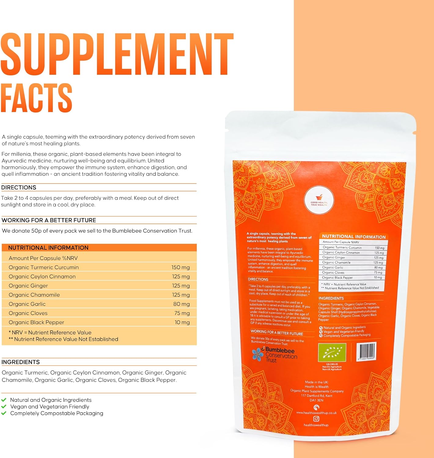 120 veganistische capsules met 7 krachtige en volledig biologische kruidenextracten om ervoor te zorgen dat u de maximale ondersteuning krijgt voor uw spijsverteringsgezondheid en het bestrijden van infecties. Gecombineerd werken ze buitengewoon goed bij het verlichten van IBS, maagpijn, krampen, misselijkheid, opgeblazen gevoel en andere gastro-intestinale problemen. Elke capsule bevat 140 mg organische kurkuma, 100 mg organische kaneel, 100 mg biologische gember, 100 mg organische kamille, 75 mg biologische knoflook, 50 mg biologische kruidnagel en 10 mg biologische zwarte peper. Biologische planten hebben een hogere voedingswaarde dan conventionele supplementen vanwege de afwezigheid van pesticiden en meststoffen. Dit herstelt de natuurlijke helende eigenschappen van de plant en stimuleert de productie van fytochemicaliën (vitamines en antioxidanten), volledig organisch en natuurlijk – zelfs de capsuleschelpen zijn gemaakt van plantaardige vezels. Bij Health is Wealth, we geven om het milieu. Daarom hebben we ervoor gezorgd dat onze verpakking 100% composteerbaar is, waardoor er geen schadelijk afval achter blijft. We zijn ook van mening dat het voortbestaan van hommels essentieel is omdat ze een cruciale rol spelen in ons ecosysteem. Ze bestuiven eigenlijk 75% van onze essentiële voedselgewassen. Om ervoor te zorgen dat ze de hulp krijgen die ze nodig hebben, we doneren 50p van elke verkoop aan de Bumblebee Conservation Trust.