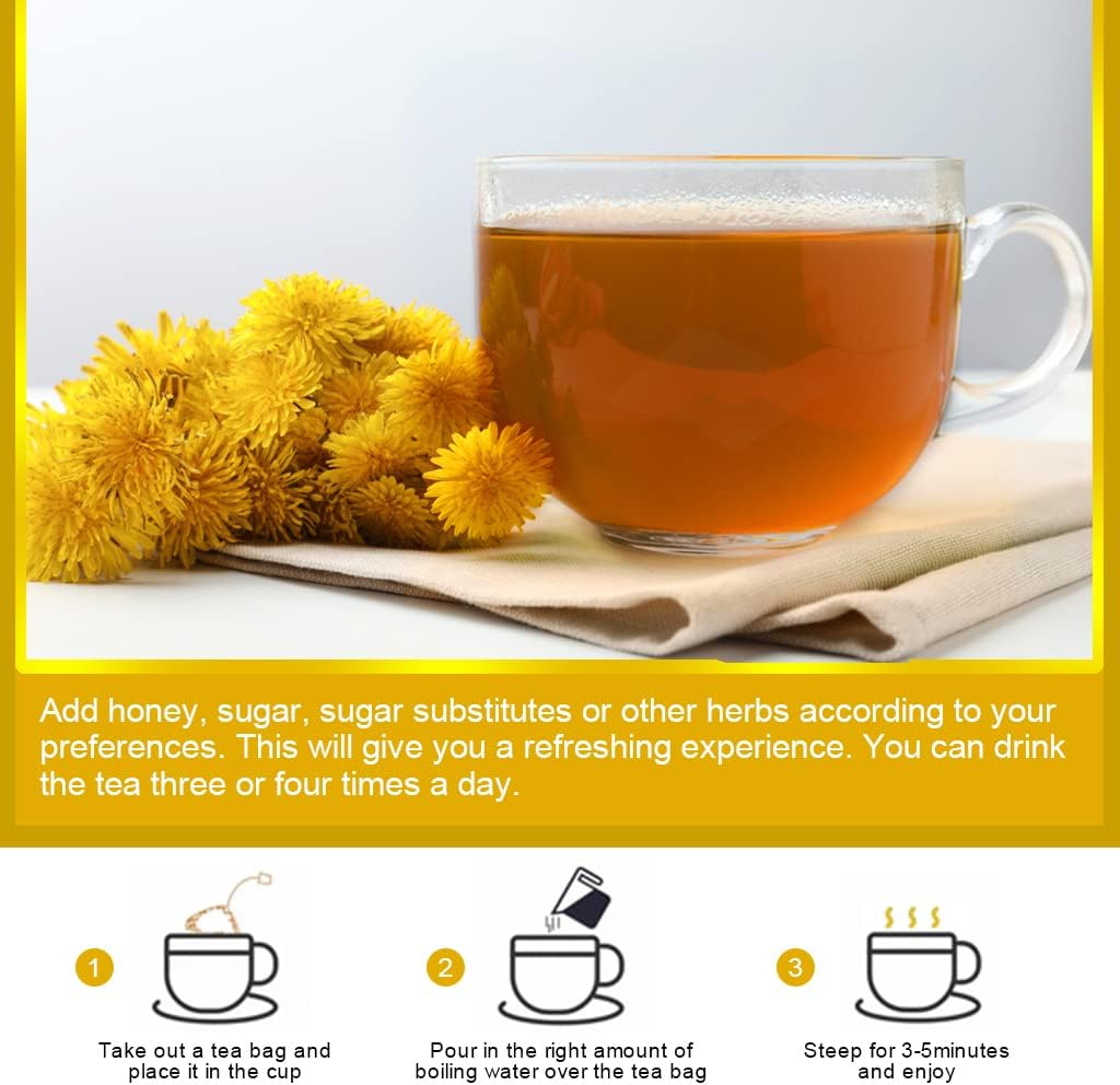 STEEPING METHODS: Toegevoegd de Dandelion Leaf & Root Tea bag gedrenkt in heet water gedurende 3-5 minuten, verwijder theezakjes. Voeg honing, suiker, suikervervangers of andere kruiden toe volgens uw voorkeuren. Dit zal je een verfrissende ervaring geven. Je kunt de thee drie of vier keer per dag drinken.