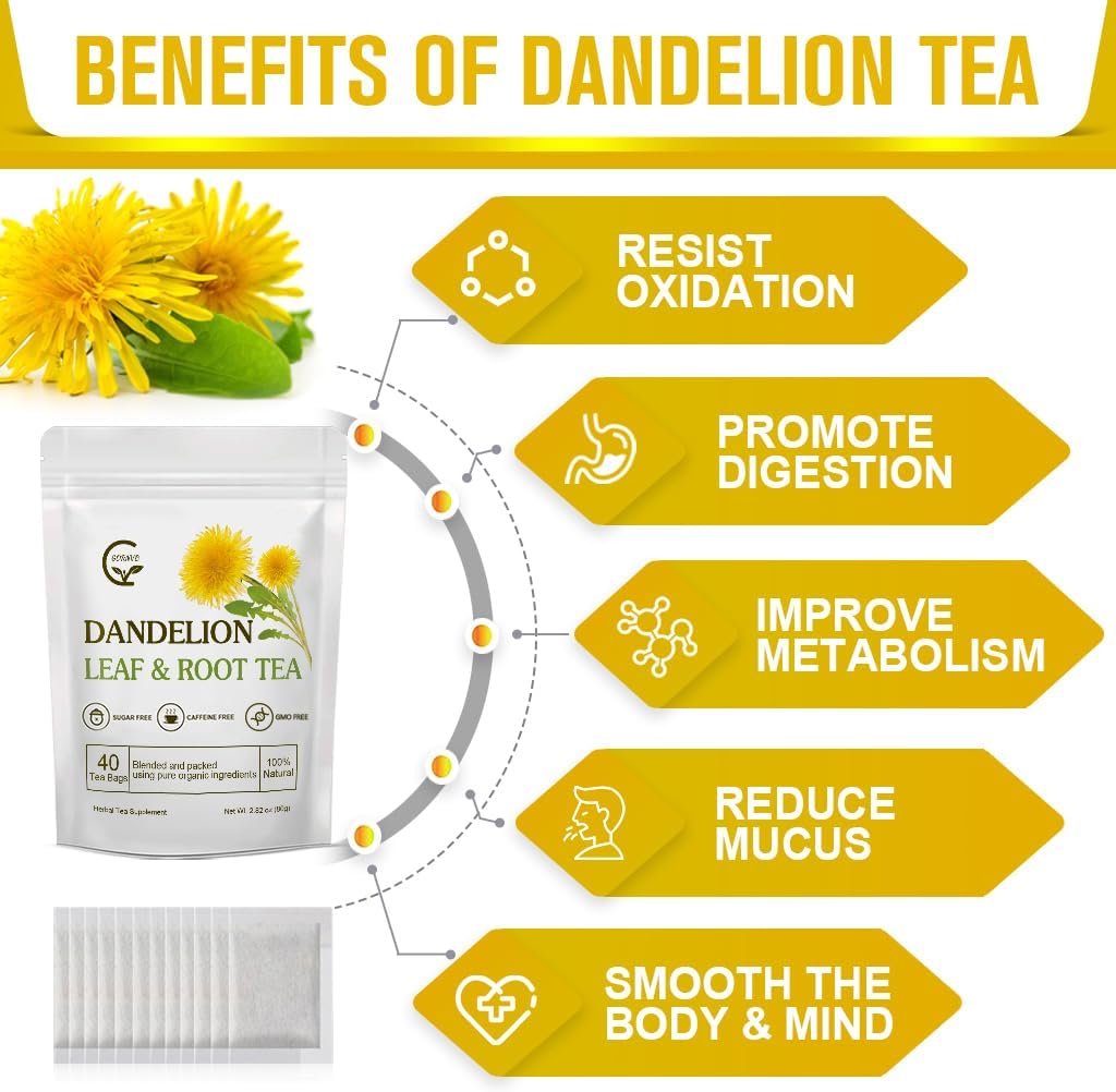 Biologische paardebloem blad & wortel thee, ondersteunt nierfunctie en gezonde spijsvertering, cafeïnevrij, 40 theezakjes