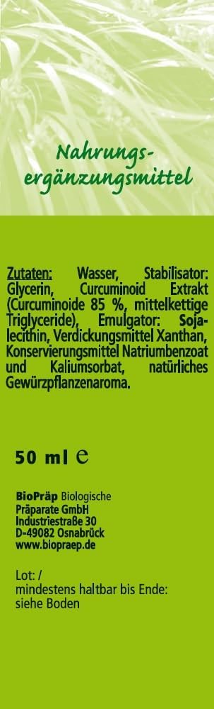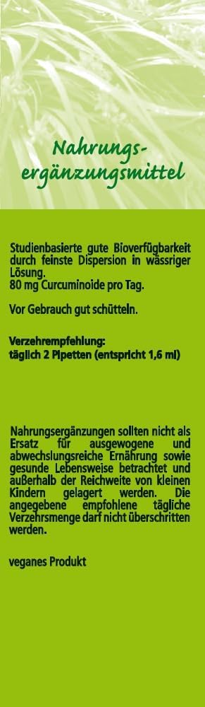 Microingekapseld micellaire curcuminoïde-extract extreem goede biologische beschikbaarheid met 40 keer betere biologische beschikbaarheid door de vorming van micellaire in de vloeistof. De positieve effecten zijn al eeuwenlang bekend in de Aziatische cultuurruimte als specerijen en in traditionele en spectiel ayurvedische toepassingen. Curcuminoïden zijn bioactieve aromatische verbindingen van de curcuma-wortelstok. Ter verbetering van de opname en verwerking worden de curcuminoïden in micellen opgenomen om ze in water oplosbaar te maken. Daardoor wordt de biologische beschikbaarheid met 40 keer verhoogd. Zo wordt met de dagelijkse hoeveelheid van 2 pipetten het effect van 600 mg curcuma-extract bereikt. Voedingsstoffen per dagelijkse dosis (=2 pipetten), curcuminoïde vloeistofextract, 1,6 ml, curcuminoïden, 15 mg aanbevolen dosering: dagelijks 2 pipetten (komt overeen met 1,6 ml). Ingrediënten: Water, stabilisator: glycerine, microingekapselde curcuminoïde extract (gamma cyclodextrine, curcuminoïden 15%), emulgator: sojalecithine, verdikkingsmiddel xanthaan, conserveringsstoffen: natriumbenzoaat en kaliumsorbat, natuurlijk kruidenplantenaroma. Veganistisch product van conventioneel product