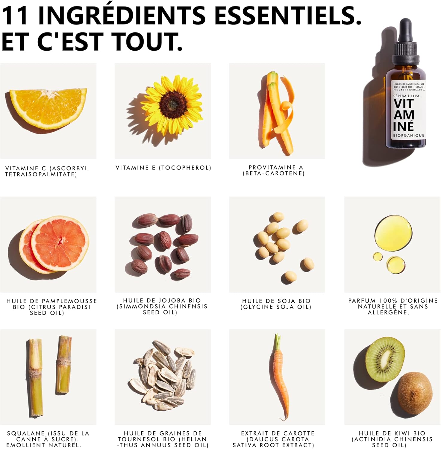 ULTRA VITAMINE SERUM | 100% natuurlijk | 100/100 YUKA | Multifunctioneel effect / Voedt + Gezonde glans en antivermoeidheidseffect + Beschermt tegen externe agressies + Antirimpels en fijne lijntjes + Stimuleert de celregeneratie + Behoudt de elasticiteit van de huid + Kalmeert | Slechts 8 essentiële ingrediënten, waaronder een botanische mix van 5 BIOLOGISCHE oliën.