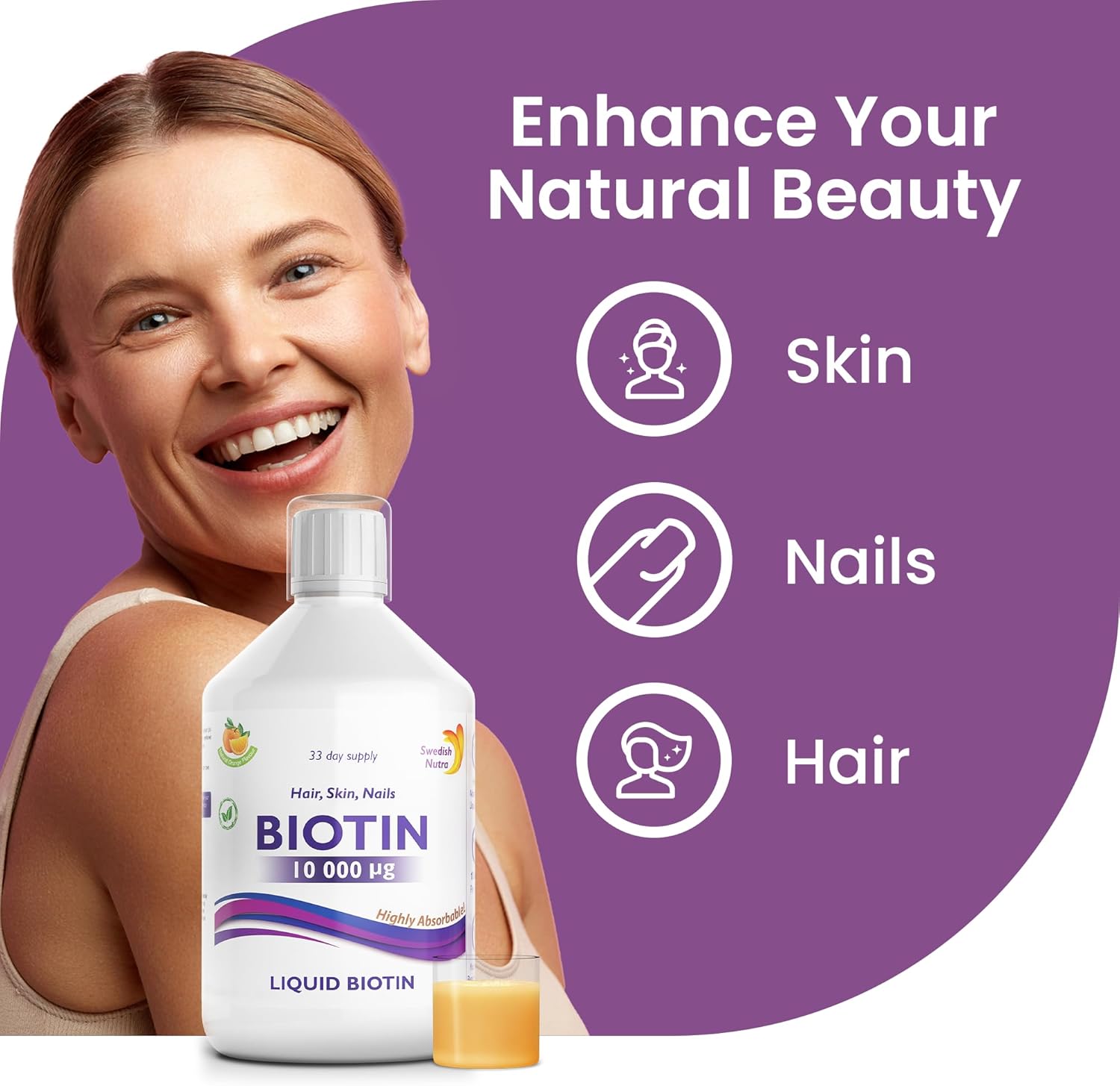 VOOR GEZOND HAAR, HUID & NAGELS: Verpakt met sterk absorbeerbare vloeibare biotine en vitamine C om de gezondheid en elasticiteit van de huid te ondersteunen, normale haargroei en dikte te stimuleren en nagelsterkte en kwaliteit te stimuleren