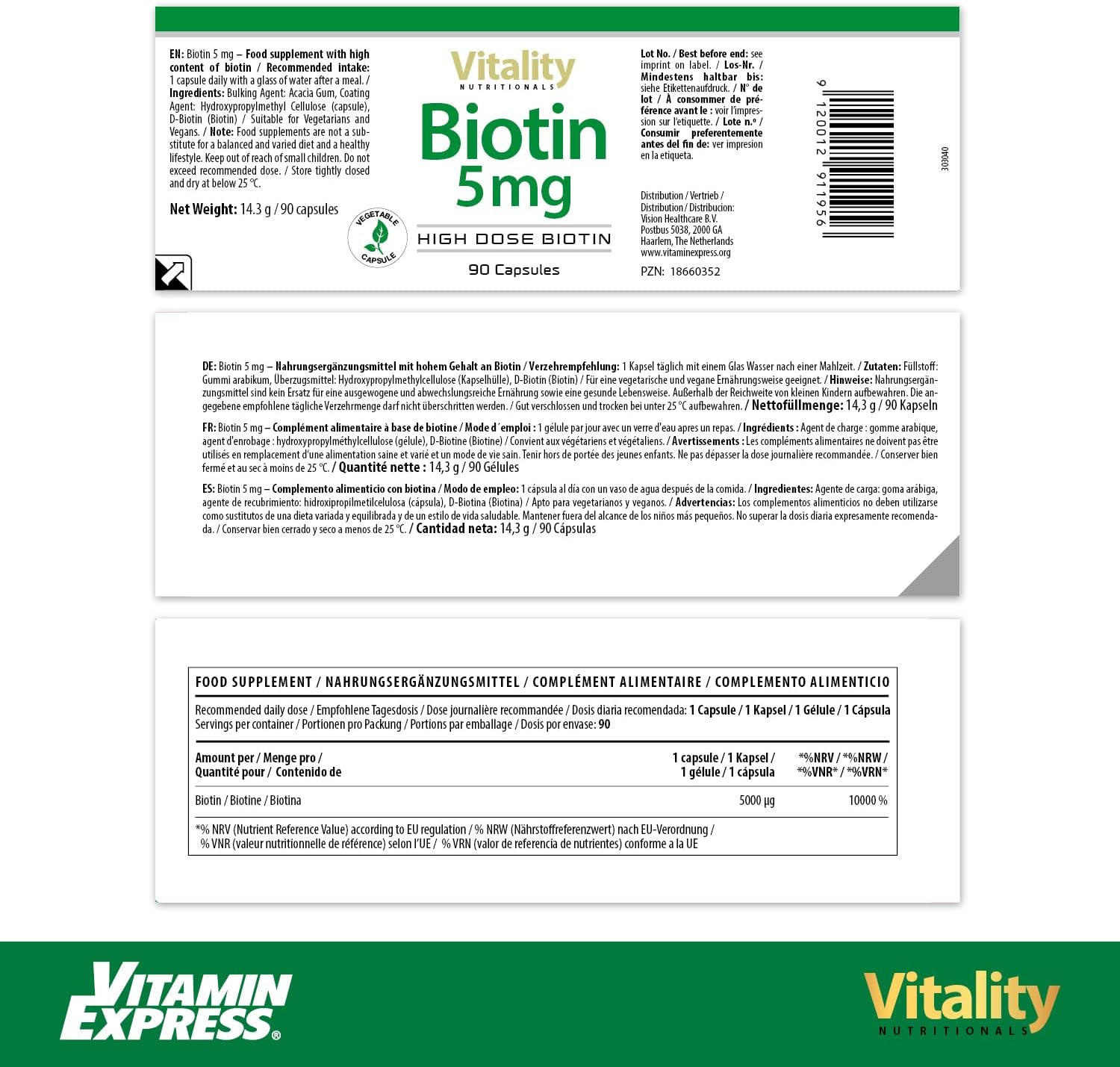 5 reviews for Biotine capsules hoge dosering, vrij van ongewenste additieven, vitamine B7 capsules, B-vitaminen, biotine 5 mg/5000 mcg huid haar nagels Vegan (90 capsules) Vitality Nutritionals by VitaminExpress