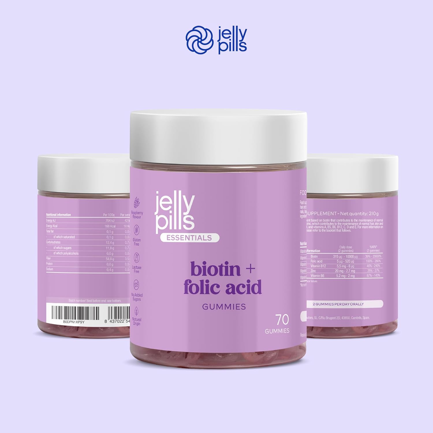 Lo primero que hay que destacar es que este producto está elaborado o fabricado en España (Unión Europea); por lo que el producto cumple con los controles sanitarios correspondientes a nivel Español y Europeo.Lo segundo que hay que destacar es que estas gominolas no contienen químicos y están elaboradas a base de productos naturales. Por lo tanto, se garantiza que el producto no provocará efectos secundarios; al menos de gravedad.NOTA: En caso de dudas sobre si este producto puede afectar a alguna patología que sufráis o que podáis sufrir, os recomiendo que antes de comprarlo os asesoréis con vuestro médico de cabecera.Las Gominolas para el Cabello con Biotina + Acido Fólico + Zinc + Vitaminas de la marca JELLY PILLS vienen en un bote de plástico alimentario transparente sin precinto en la tapa pero con sello de garantía de conservación bajo esta (bajo la tapa). Lo que garantiza que no se mermarán las propiedades de sus componentes así como asegurar el producto contra agentes externos hasta su primer uso.Puesto que estas gominolas no son chuches, se recomienda mantenerlas alejadas de los más peques de la casa.En el exterior de cada bote tenemos impreso texto referente al producto como por ejemplo su composición, sus valores energéticos… etc. El texto impreso está en Inglés pero en el anverso de la etiqueta encontraremos más idiomas; entre ellos tenemos el Español.Dentro nos encontramos hasta con 70 gominolas de color rojo semi transparente y con sabor a frambuesa. Cabe destacar que el bote dice que tiene 70 gominolas pero el vendedor expone aquí que tiene 60. No las he contado pero si se pesa una gominola y se multiplica por 70, el resultado es el que el bote dice que es su peso neto, por lo que el número correcto de gominolas es de 70.Cada gominola pesa aproximadamente 3 gramos y el fabricante/vendedor “recomienda” DOS gominolas al día. Por lo tanto, con un 1 bote tendremos suministro para más de 30 días (más de 1 mes) si tomamos 2 gominolas por día (noche).Cada gominola contiene, entre otros:- Biotina.- Acido Fólico.- Zinc.- Vitamina B5.- Vitamina B6.- Vitamina B12.- Vitamina C.- Vitamina E.Por lo tanto, a la vista de lo que contiene cada gominola, no solo nos serán útiles para el cuidado del cabello sino que también, en menor medida, nos aportarán, entre otros, cuidado oxidativo, cuidado para nuestras uñas… etc.Os recomiendo que cuando os toméis las gominolas no las mastiquéis porque si las chupáis en lugar de masticarlas el sabor será mucho mejor que si las masticáis. No es que estén malas pero están más deliciosas sí las chupáis como si fuesen un caramelo.En resumen, por la buena relación cantidad precio, así como por los ingredientes que contiene, os recomiendo el producto con 5 estrellas.