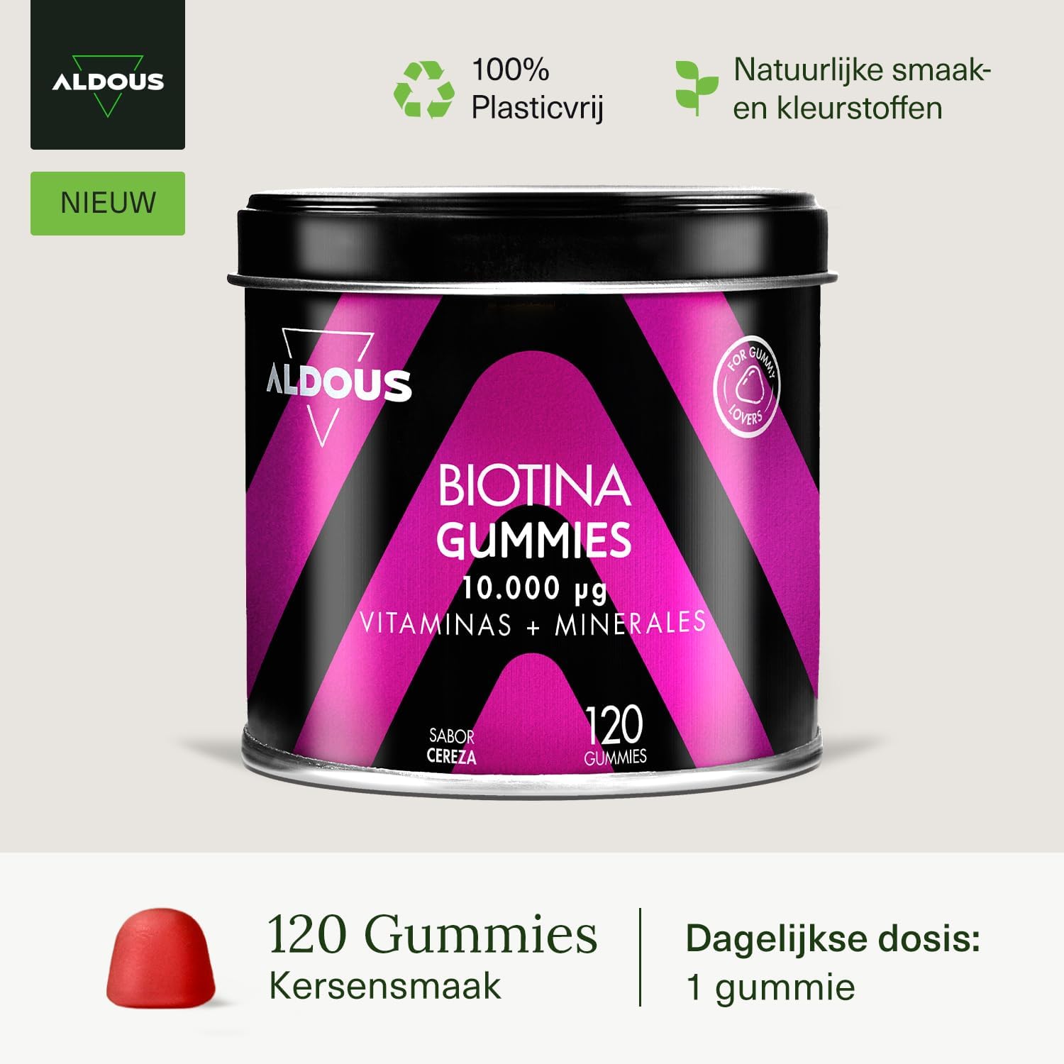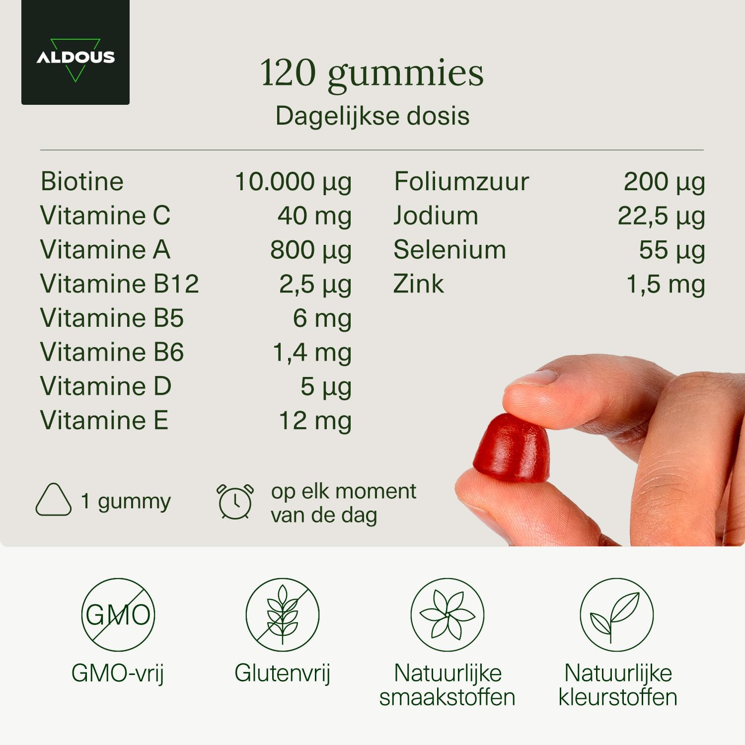 🌱 VOOR GUMMY LOVERS – Ons kauwbaar vitaminesupplement in de vorm van vitaminegummies is een alternatief voor pillen of producten in poedervorm. Aldous gummies zijn glutenvrij, lactosevrij en GMO-vrij. Ze zijn ook vrij van kunstmatige smaak-, kleur- en zoetstoffen. Ze hebben een natuurlijke kersensmaak en een laag suikergehalte. Met slechts 1 gummie per dag krijg je je dagelijkse dosis gedurende 4 maanden.