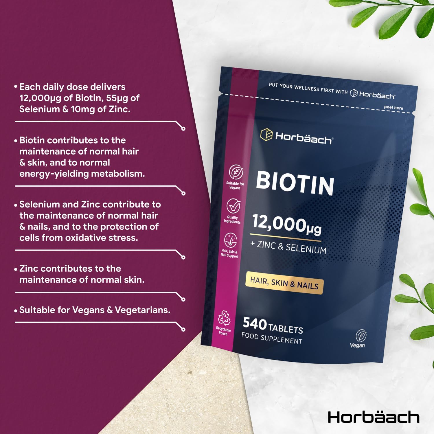 Verbeter uw dagelijkse voeding met Horbaach Biotin Complex tabletten. Deze innovatieve formule levert 12.000 mg biotine, 10 mg zink en 55 µg selenium per dagelijkse dosis in superhandige tabletten.