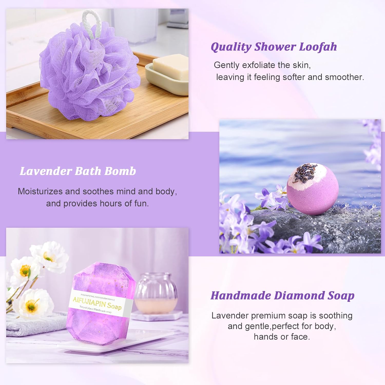 Relaxation and self-care gift for women: Our birthday spa gift baskets contain bath and aromatherapy products. The aromatherapy candle exudes a warm lavender scent as it burns, creating a romantic atmosphere, the handmade soap and bath bomb bring her a luxurious spa experience at home. The hand mask and foot mask can be used to nourish and moisturize the skin. Lavender essential oils soothe your mind, soothe your senses, relax you and remove the fatigue of the day.