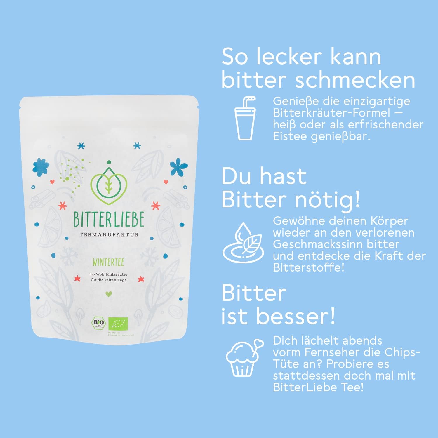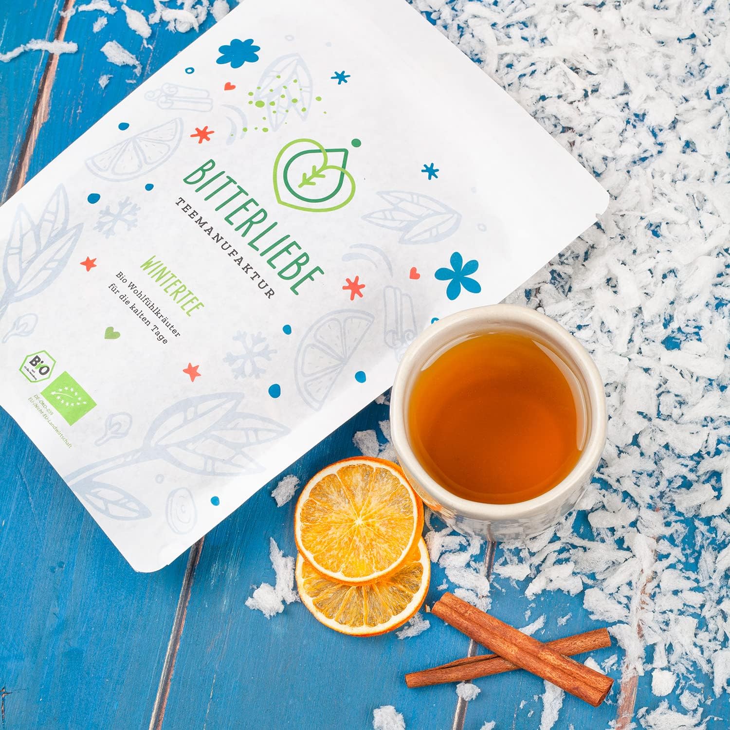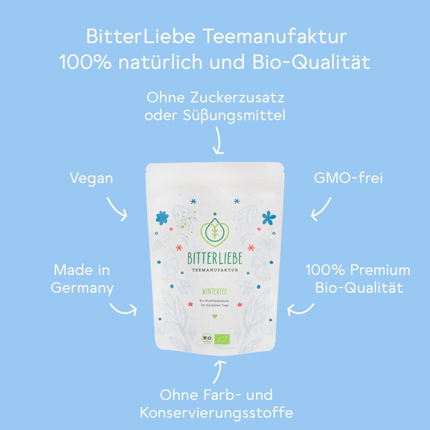 BitterLiebe® Teemanufaktur Wintertee Bio kruidenthee, losse 140 g met de kracht van de bittere stoffen, bittere kruiden, rozenbottels, gember en nog veel meer, ca. 70 kopjes