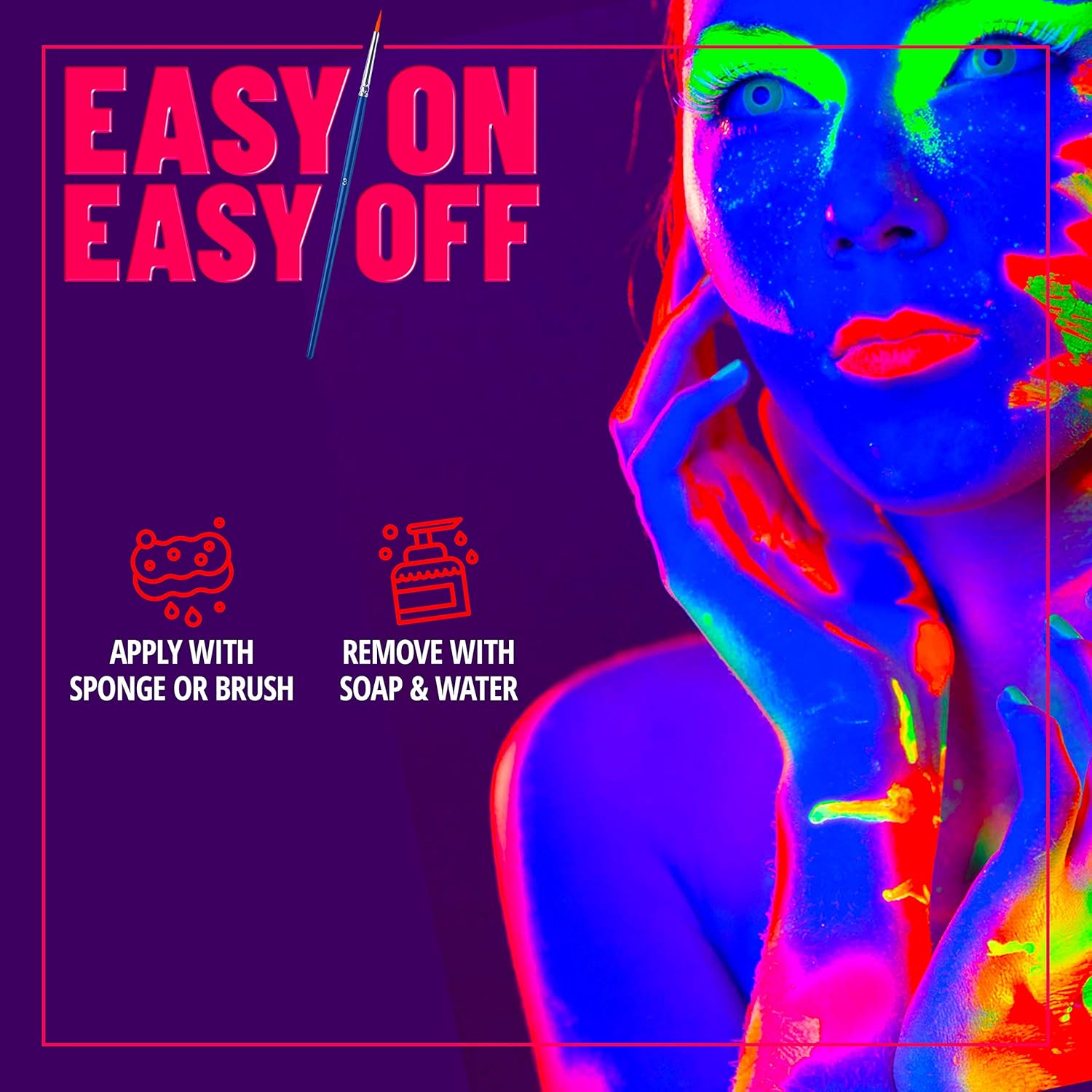 I actually love this make a face paint, it coverage is great, goes on well, lasts well and is easy to remove but unfortunately the neon range fails. If it was sold as a box of four, using the colours that actually work it would be great. Unfortunately there are two extra paints that don’t work but you are still charged for. The blue does not show up I. UV and the white isn’t really white, it’s difficult to apply and doesn’t show up in UV. However the other 4 colours are great. Hence 3 stars as only 2 thirds of the product worked.