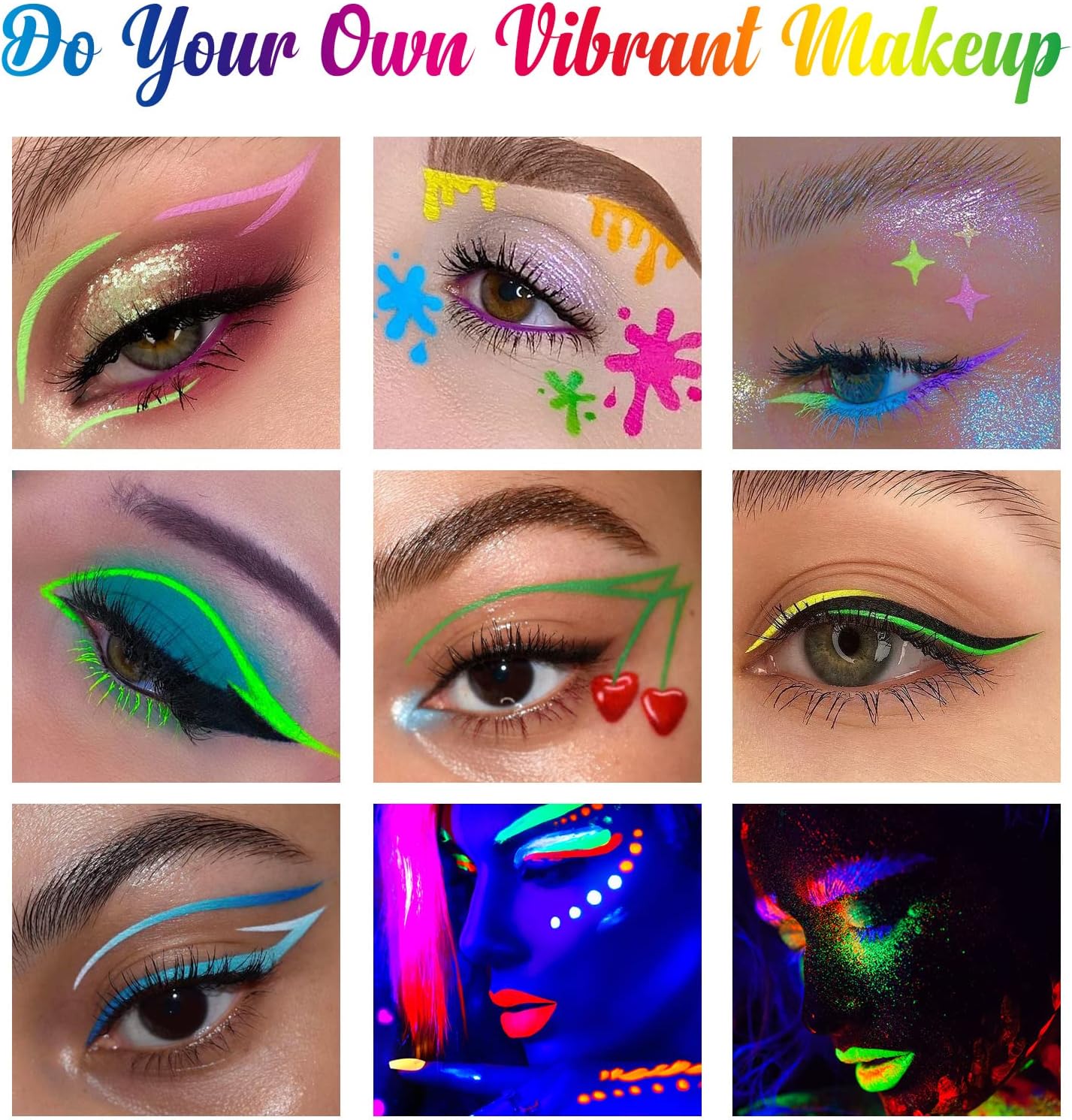 Uv-lichtpunt: onze uv-eyeliner-set is uniek, de neonkleurige vloeibare eyeliner brandt onder uv-licht, perfect voor deelname aan uv-lichtfeesten, de eyeliner droogt snel en blijft de hele dag lang plakken