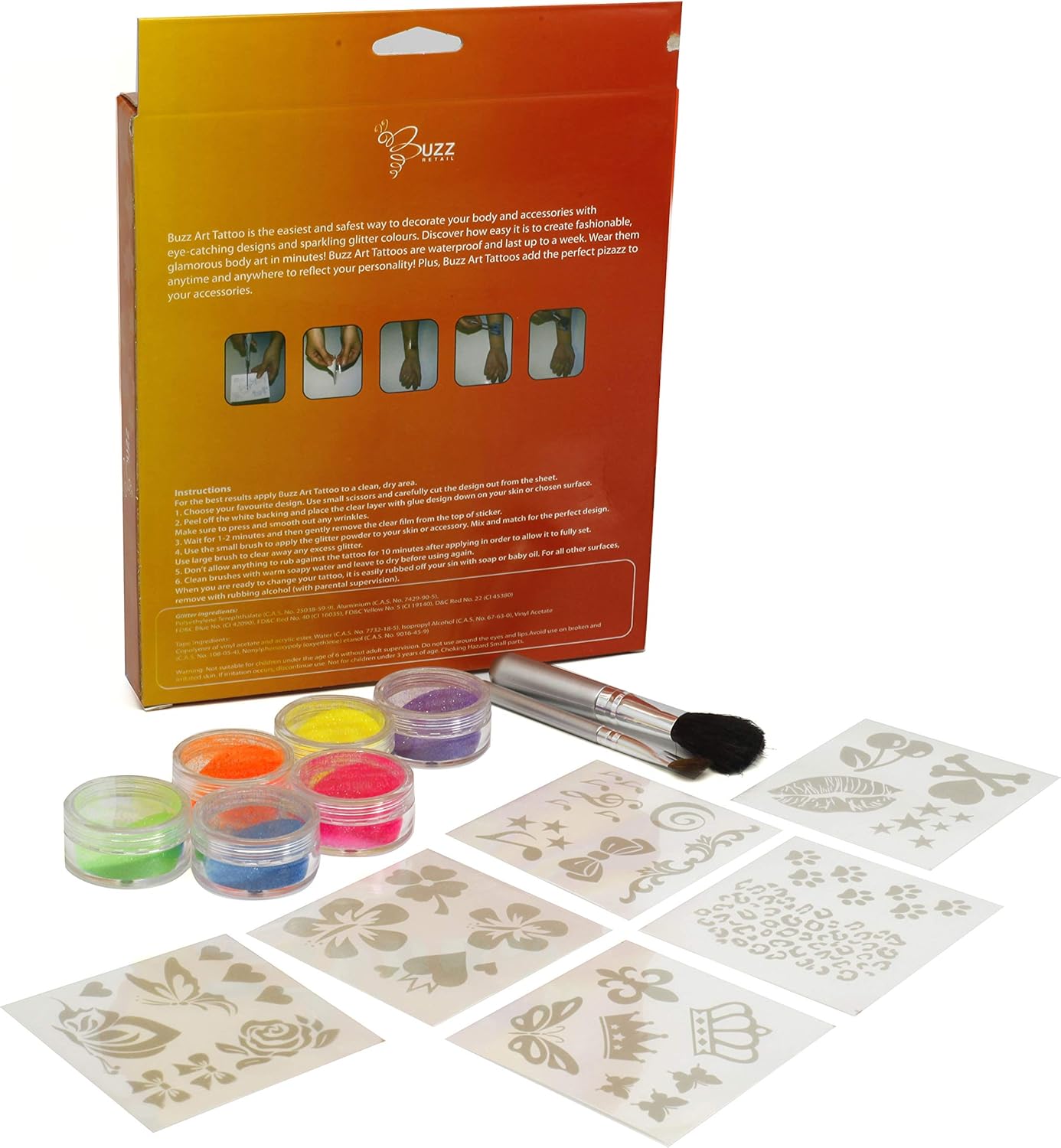 Maak glittertatoeages die een week op je huid dragen, maar ze kunnen gemakkelijk met water worden verwijderd. Het is de eenvoudige en veilige manier om je lichaam te versieren met opvallende designs en glinsterende kleuren. Elke set bestaat uit 25 coole designs en 6 uitstekende glitterpotten, zodat je verschillende kleurencombinaties kunt maken. Leg je gekozen ontwerp gewoon op een schoon, droog gebied, houd het 1-2 minuten en verwijder de transparante folie voorzichtig van de bovenkant van de sticker. Breng de kleur glitter combinatie van je keuze aan met een klein penseel en je tattoo is compleet. Met drie originele tattoosets, klassiek, actie en glowing, er is er één voor iedereen.