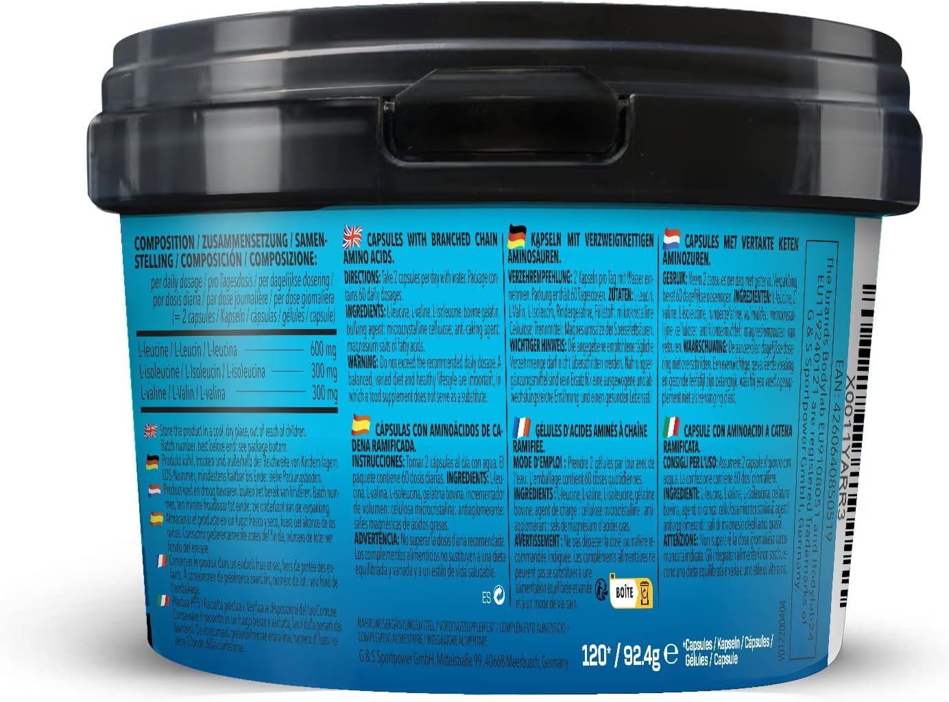 Bodylab24 BCAA 120 capsules, 1200mg BCAA in een verhouding van 2:1:1 per portie, bevat L-leucine, L-isoleucine en L-valine, gemakkelijke dosering door praktische capsulevorm