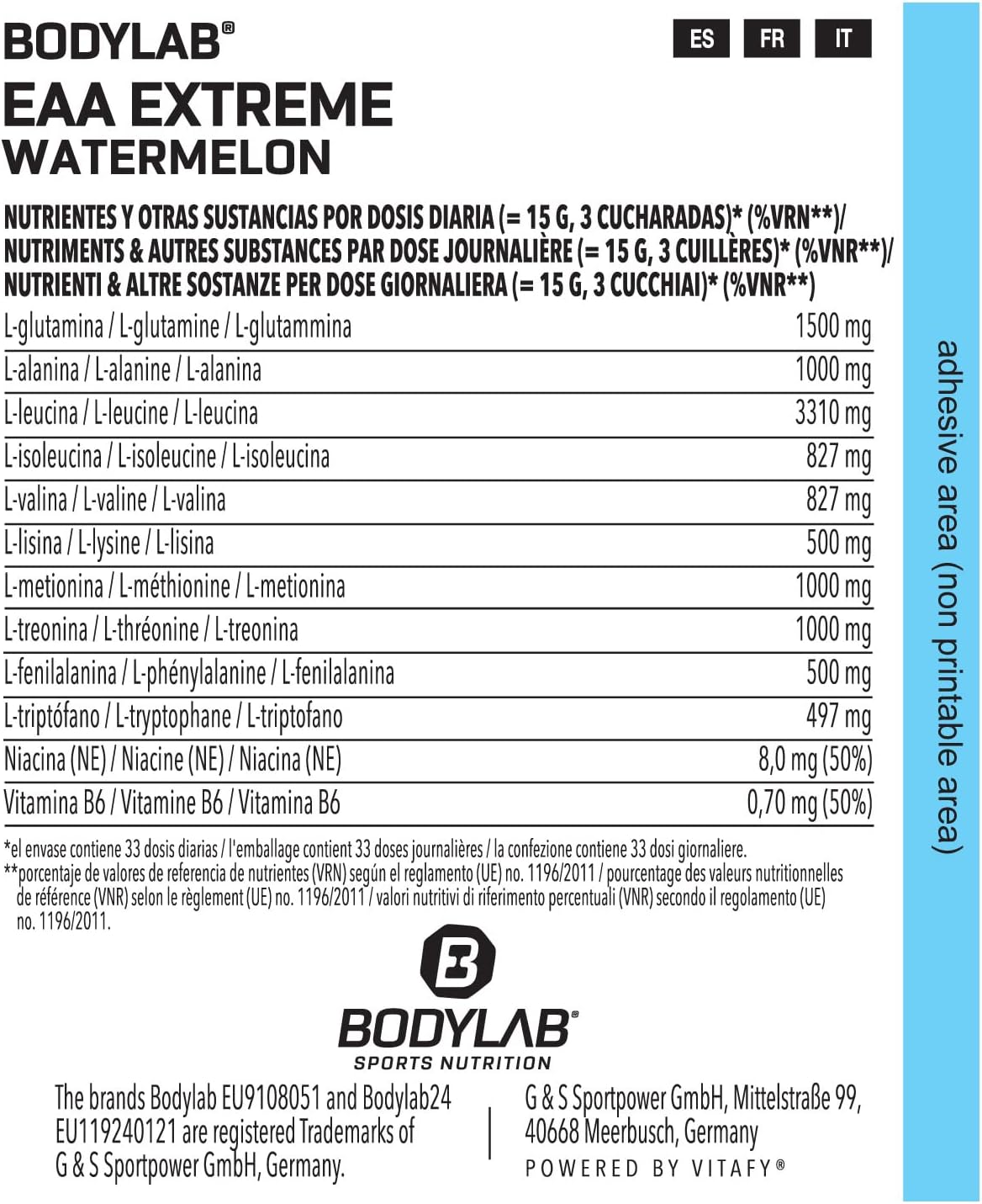 Bodylab24 EAA Extreme 500g watermeloen, essentiële aminozuren, met 1,5g glutamine, 1g alanine en vitamine B6 en B3 als een fruitige drank voor regeneratie en spieropbouw