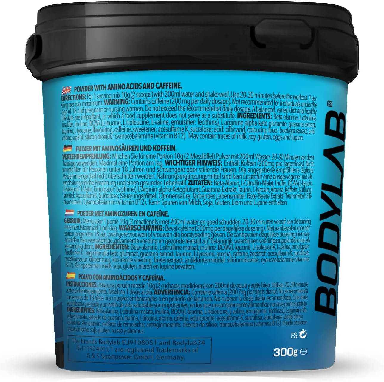 Bodylab24 Pre-Workout Booster Watermeloen 300g, Energie drank voor de training, booster met 136mg cafeïne, taurine & guarana extract, essentiële BCAA aminozuren en beta-alanine, arginine, citrulline