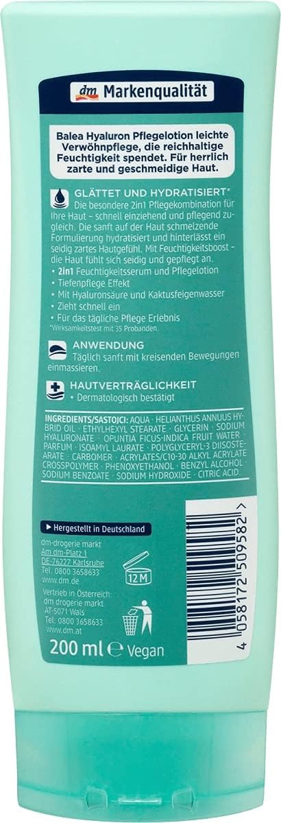 Balea Bodylotion Hyaluron, 1 x 200 ml: de Balea Hyaluron verzorgende lotion is een lichte verwenverzorging die rijke hydrateert, voor een heerlijk zachte en soepele huid. De zacht op de huid smeltende formule hydrateert en laat een zijdezacht huidgevoel achter. De vochtboost zorgt ervoor dat de huid zijdezacht en verzorgd aanvoelt. Hyaluronzuur en cactusvijgenwater zorgen voor een diepteverzorging. Gebruiksaanwijzing: dagelijks zachtjes met cirkelvormige bewegingen inmasseren. Ingrediënt: Aqua | Helianthus Annuus Hybrid Oil | ethylhexyl stearaat | glycerine | natriumhyaluronaat | Opuntia Ficus-Indica Fruit Water | Parfum | Isoamyl lauraat | Polyglyceryl-3 diisostearaat | Carbomeer | Acrylates/C10-30 Alkyl Acrylaat Crosspolymeer | Fenyl-acrylaat oxyethanol | Benzylalcohol, natriumbenzoaat, natriumhydroxide, citroenzuur. Gemaakt voor: dm-drogerie markt GmbH + Co. KG, Am DM Platz 1, 76227 Karlsruhe.
