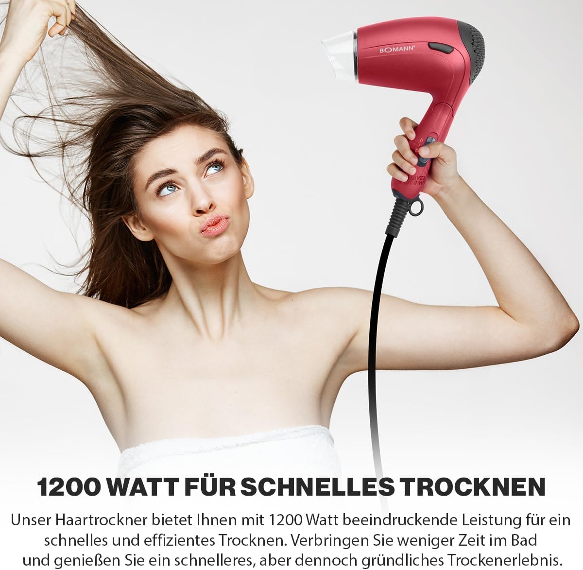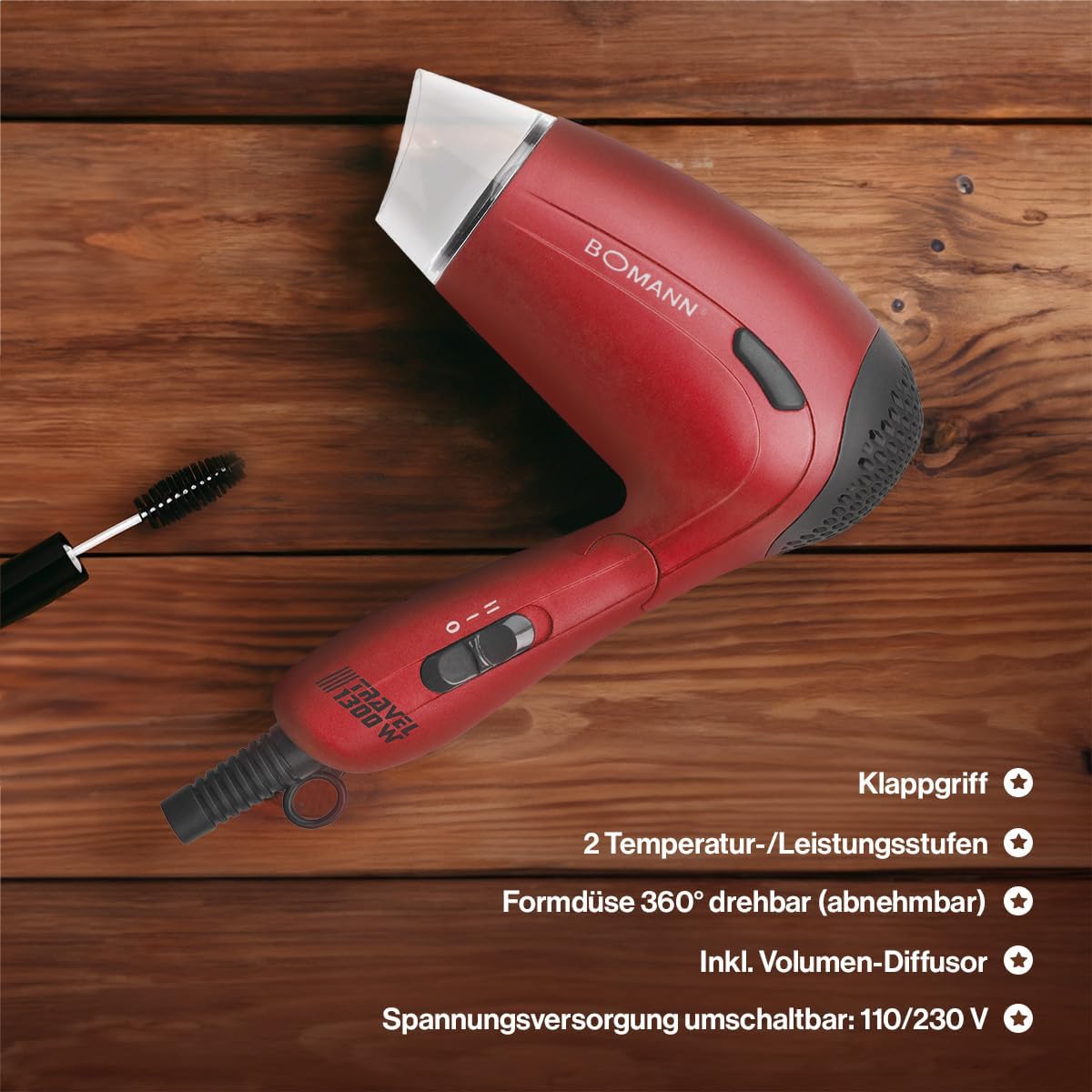 Bomann HTD 8005 CB compatker reishaardroger, 2 temperatuur-/vermogensniveaus, klapgreep, vormmondstuk 360° draaibaar (afneembaar), soft touch behuizing, incl. volumediffusor, rood