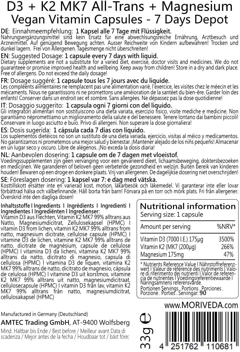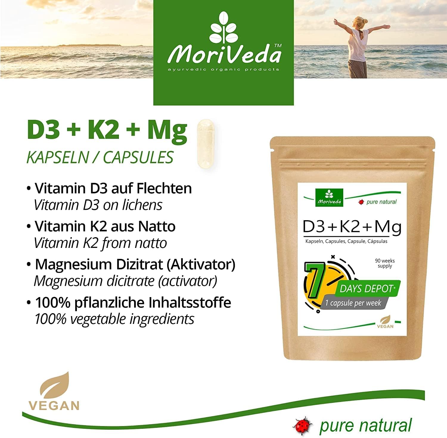 VITAMINE D3+K2+MG: De unieke veganistische samenstelling biedt vitamine D3 uit korstmos (7000 IE), vitamine K2 als MK-7 99% all-trans uit natto (200 µg) perfect aangevuld met magnesium om de biologische beschikbaarheid van de vitamines vele malen te verhogen over. Het magnesium dat het bevat kan helpen om vitamine D (cholecalciferol) direct in de maag te activeren. In het laboratorium geteste productie uit Duitsland.
