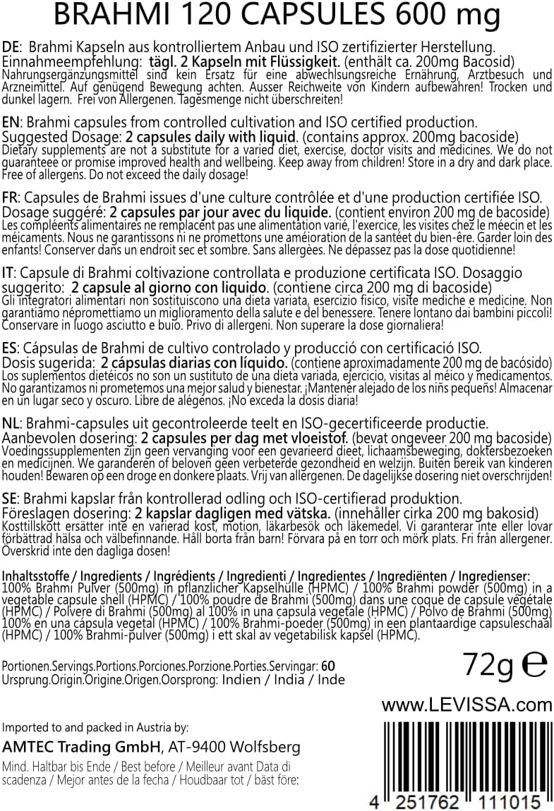 BRAHMI: De Aziatische moerasplant bevat onder andere saponinen, vitamine A, B, E en K, alcaloïden, fytochemicaliën, flavonoïden, triterpenen en mineralen. Saponinen ondersteunen de hersenfunctie (leerbereidheid, informatieverwerking) en geven de plant de gewone naam geheugenplant.