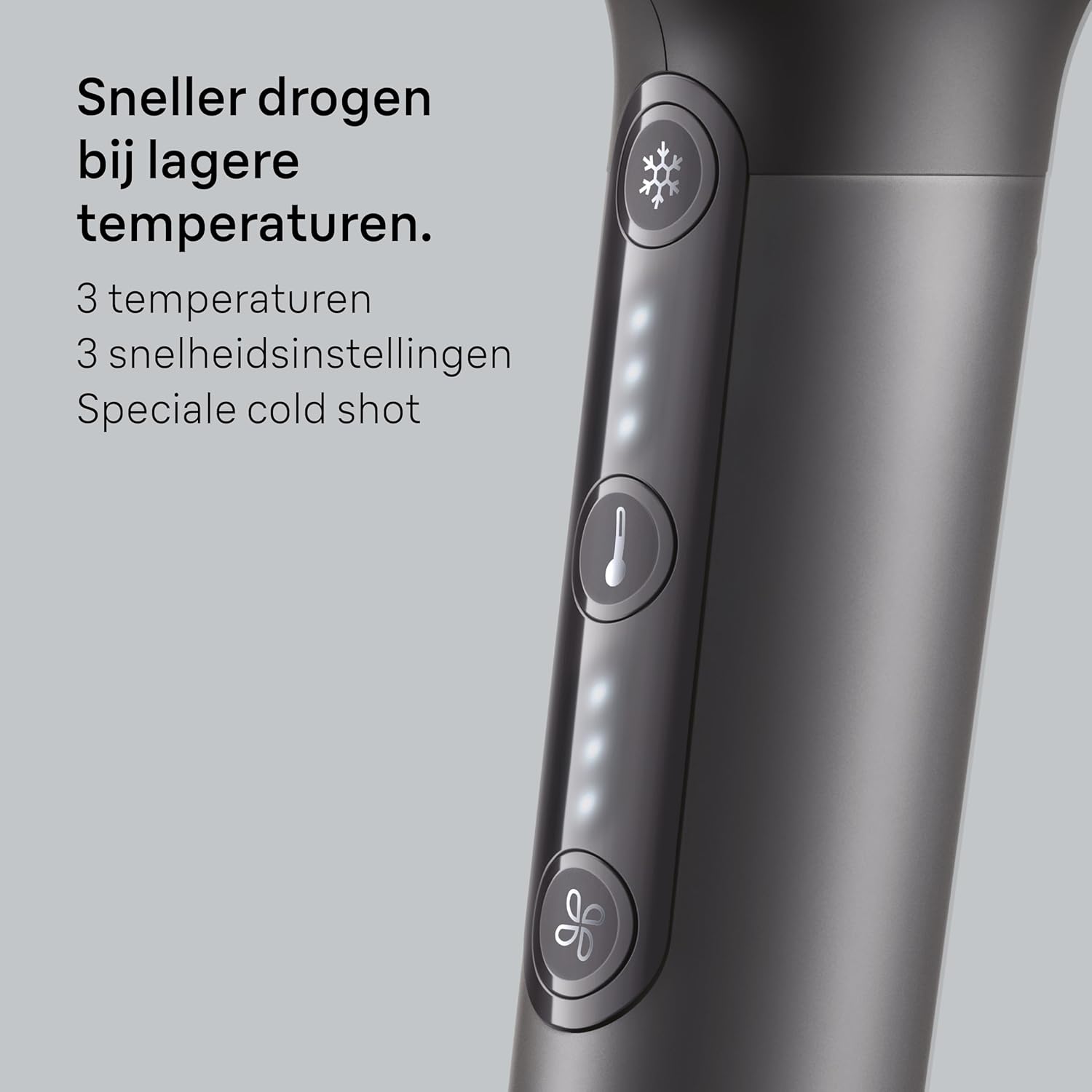 SNELLER DROGEN BIJ LAGERE TEMPERATUREN: Geoptimaliseerde HTDC-motor van 2100 W levert een ultrakrachtige luchtstroom met hoge snelheid.
