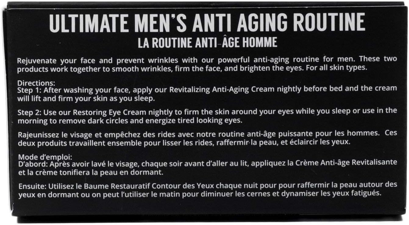 De beste huidverzorgingsproducten voor mannen tegen rimpels, donkere kringen, zwellingen en tekenen van veroudering. Deze twee anti-aging producten voor mannen werken samen om een eenvoudige, maar krachtige huidverzorging te bereiken, die onmiddellijke en merkbare resultaten levert. De revitaliserende anti-aging crème voor mannen verstevigt en maakt de huid glad. Deze rimpelcrème voor mannen voorkomt ook de vorming van toekomstige rimpels. Onze herstellende oogcrème voor mannen vermindert zwellingen en kringen rond de ogen. Deze oogcrème voor mannen maakt ook fijne lijntjes en rimpels rond de ogen glad. Gemaakt voor alle huidtypes.