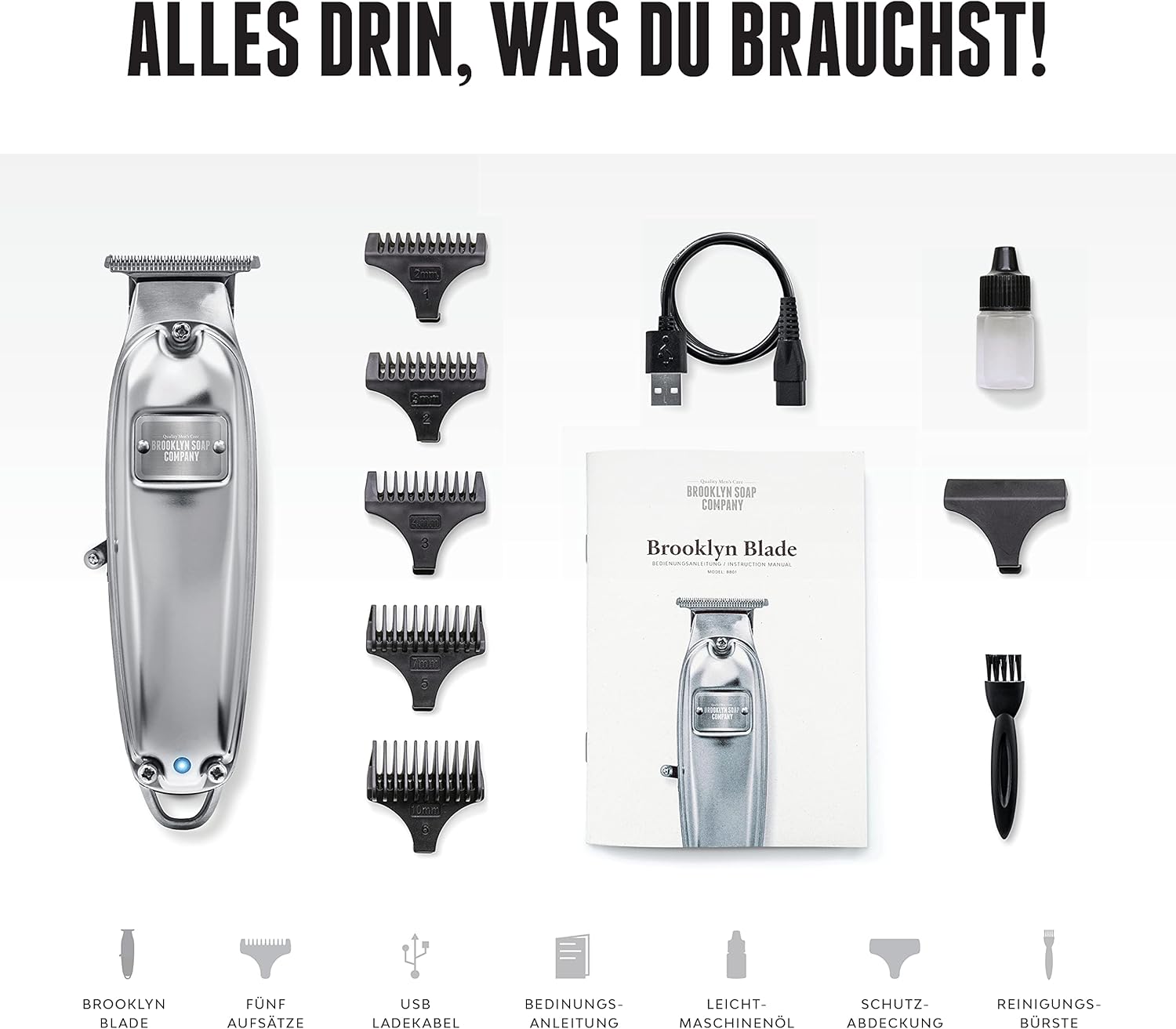 Inhoud levering: naast onze Brooklyn Blade ontvang je 5 opzetstukken voor je individuele baardstijl, een beschermkap, een reinigingsborstel, lichte machineolie, een USB-oplaadkabel en een gebruiksaanwijzing (mogelijk niet beschikbaar in het Nederlands).