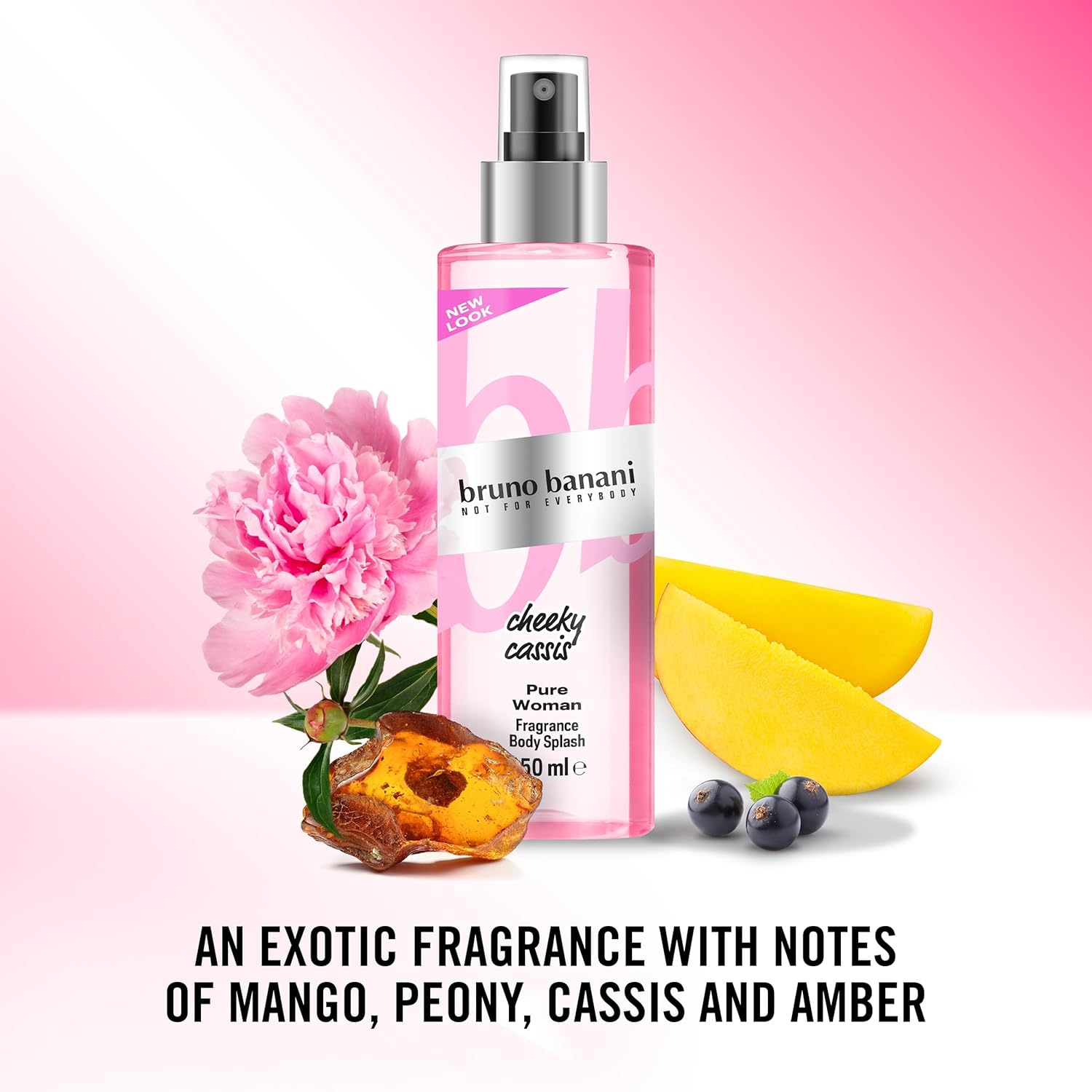 bruno banani Body Splash Body Spray cassis. De coole frisheid voor het hele lichaam. Passend bij de populairste geuren presenteert bruno banani de nieuwe lichaamssprays. De luchtige composities hebben een lagere concentratie geurolie en zetten de focus op de topnoten. Absoluut de lichtste manier om je favoriete geur te dragen – perfect voor een warme zomer. De lichaamssprays kunnen probleemloos overal mee naartoe worden genomen, ze zijn licht en niet zo breekbaar als conventionele flessen. Spuit van top tot teen op hals, armen of decolleté of gewoon het hele lichaam zachtjes omhullen. De Fragrance Body Splash kan niet alleen op de huid, maar ook op haar, kleding of lakens worden gespoten. Pure Woman – Cheeky Cassis is een brutale mix van pittige Cassis akkoorden met noten van groene mandarijn en mango. Stralend bloemige accenten geven de speelse geur een frisse, onbezorgde vrouwelijkheid.