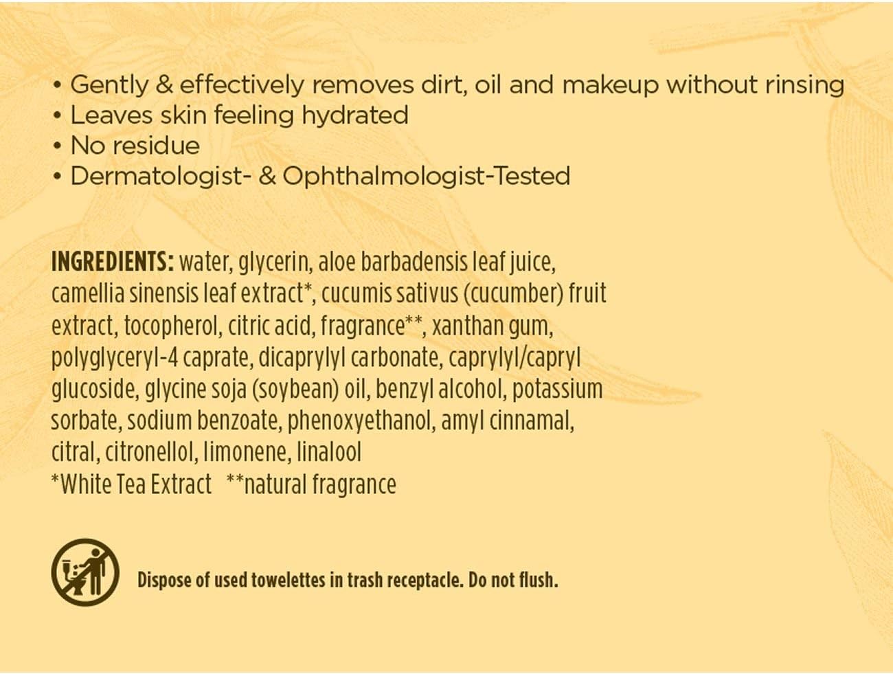 Natuurlijke ingrediënten: deze gladmakende en kalmerende, 99,1% natuurlijke gezichtsreinigingsdoekjes met witte thee-extraxt, komkommer en aloë zijn zo zacht dat ze elke dag bij normale huid kunnen worden gebruikt