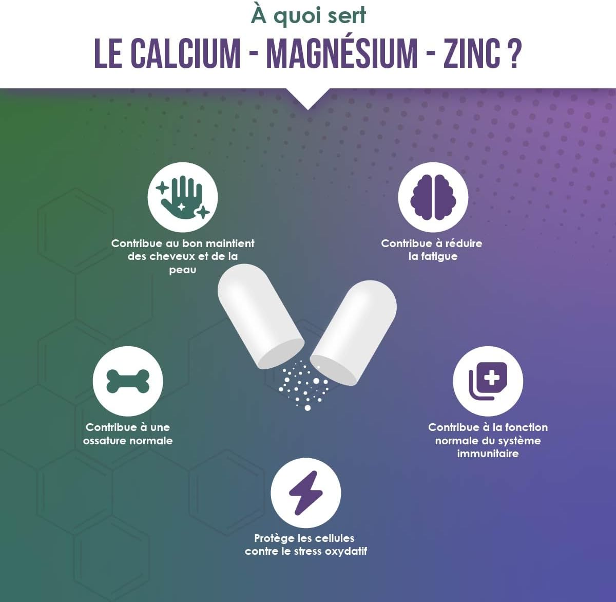 Een essentieel mineraal trio voor je welzijn ✔ Calcium: draagt bij aan het behoud van normale botten en spierfunctie. ✔ Magnesium: helpt vermoeidheid te verminderen en ondersteunt de goede werking van het zenuwstelsel. ✔ Zink: beschermt cellen tegen oxidatieve stress en draagt bij aan de gezondheid van de botten.
