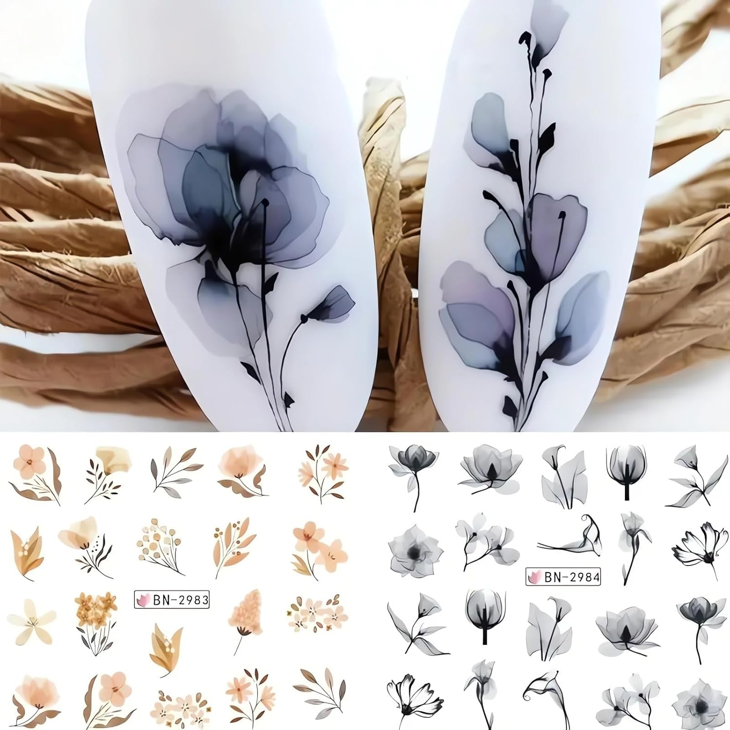 Calkrer 12 vellen nail art stickers, nagelstickers roségoud, zwarte bloem, zelfklevend, voor nagelstickers in de lentelijn met abstracte bladdecoraties.