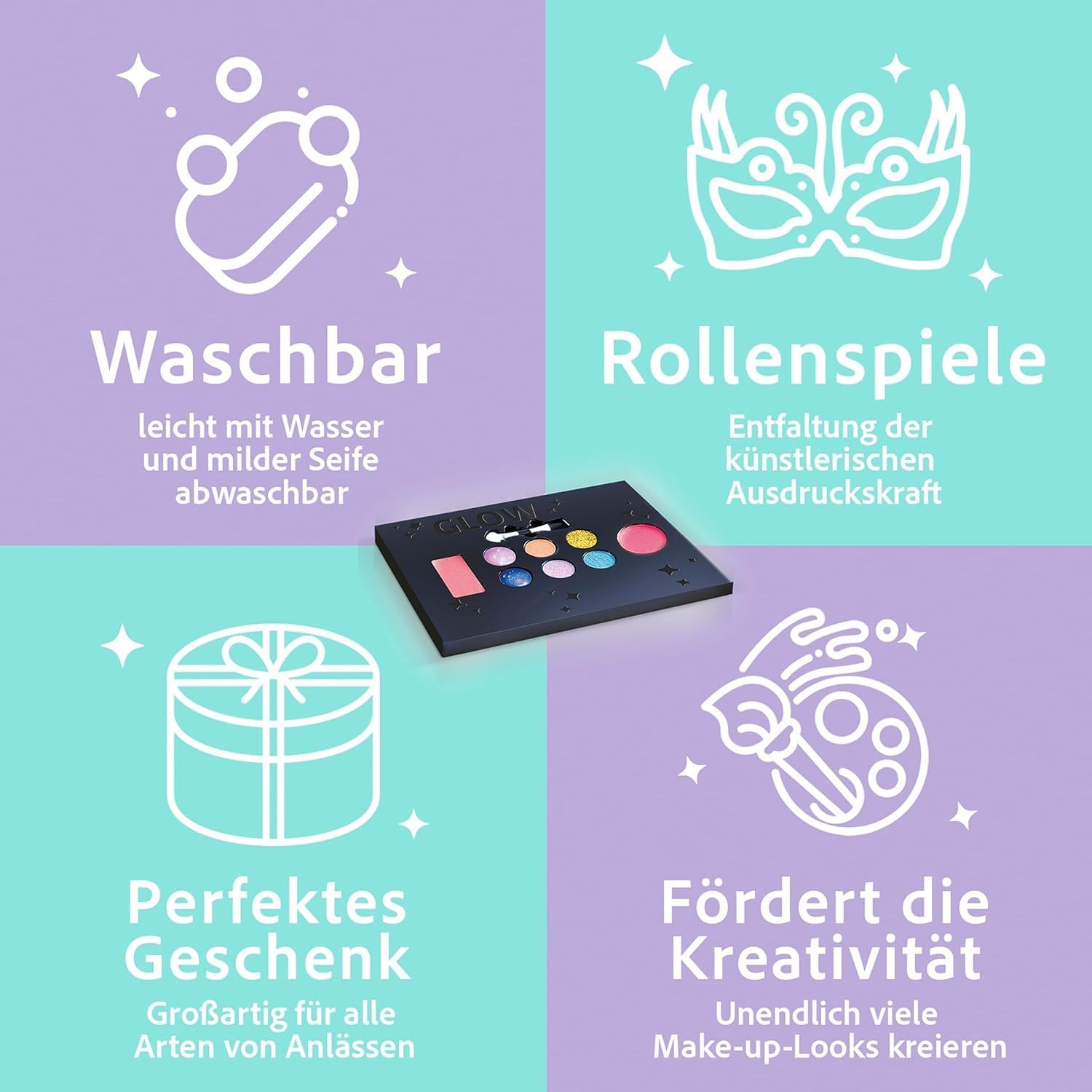 Inhoud van de set: de kinderschminkset bevat een adembenemend make-uppalet, dat speciaal voor kinderen is ontwikkeld. Laat je kleine schoonheidsliefhebbers hun creativiteit de vrije loop en druk hun persoonlijkheid uit met onze veilige en kindvriendelijke make-up.
