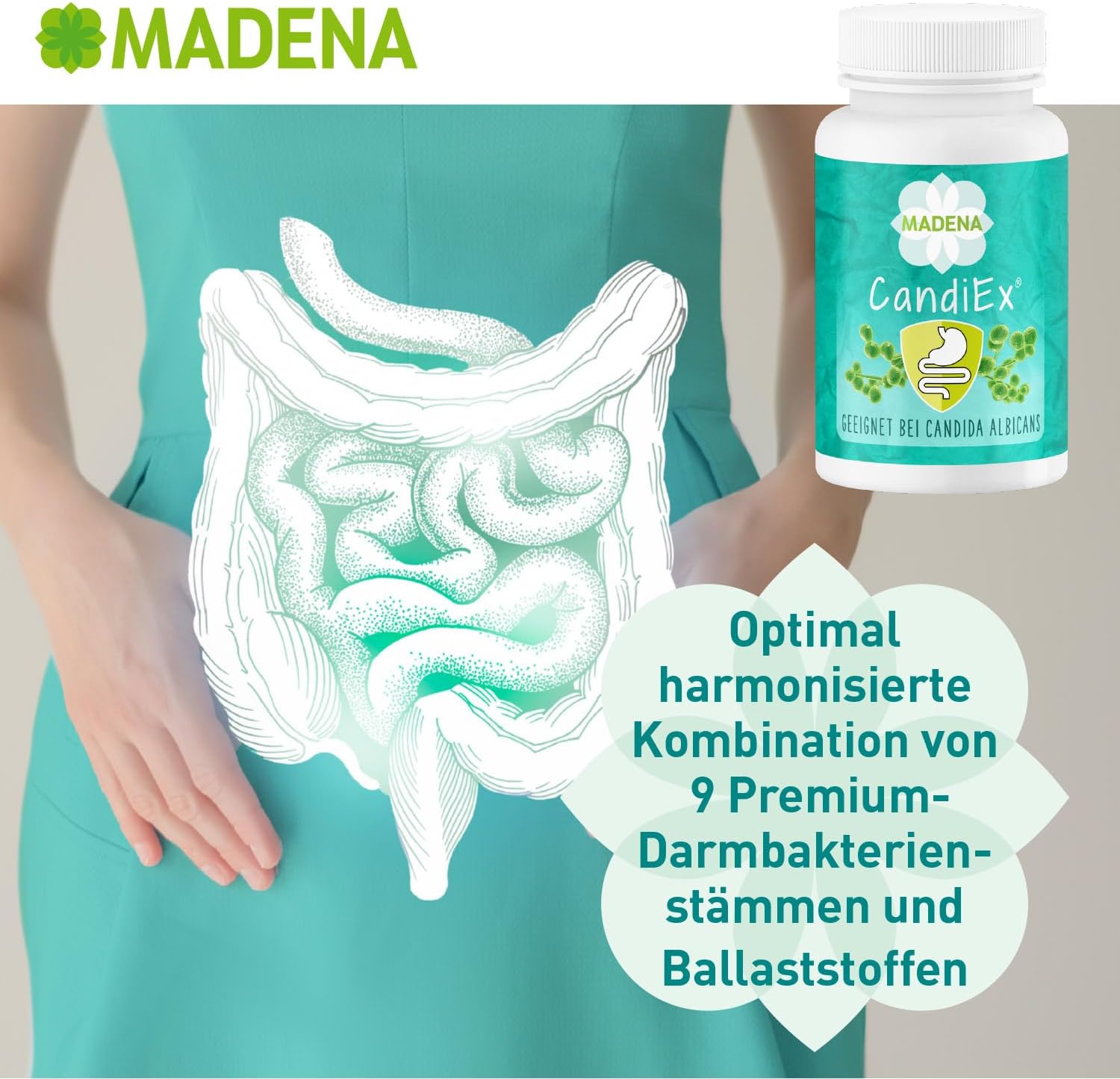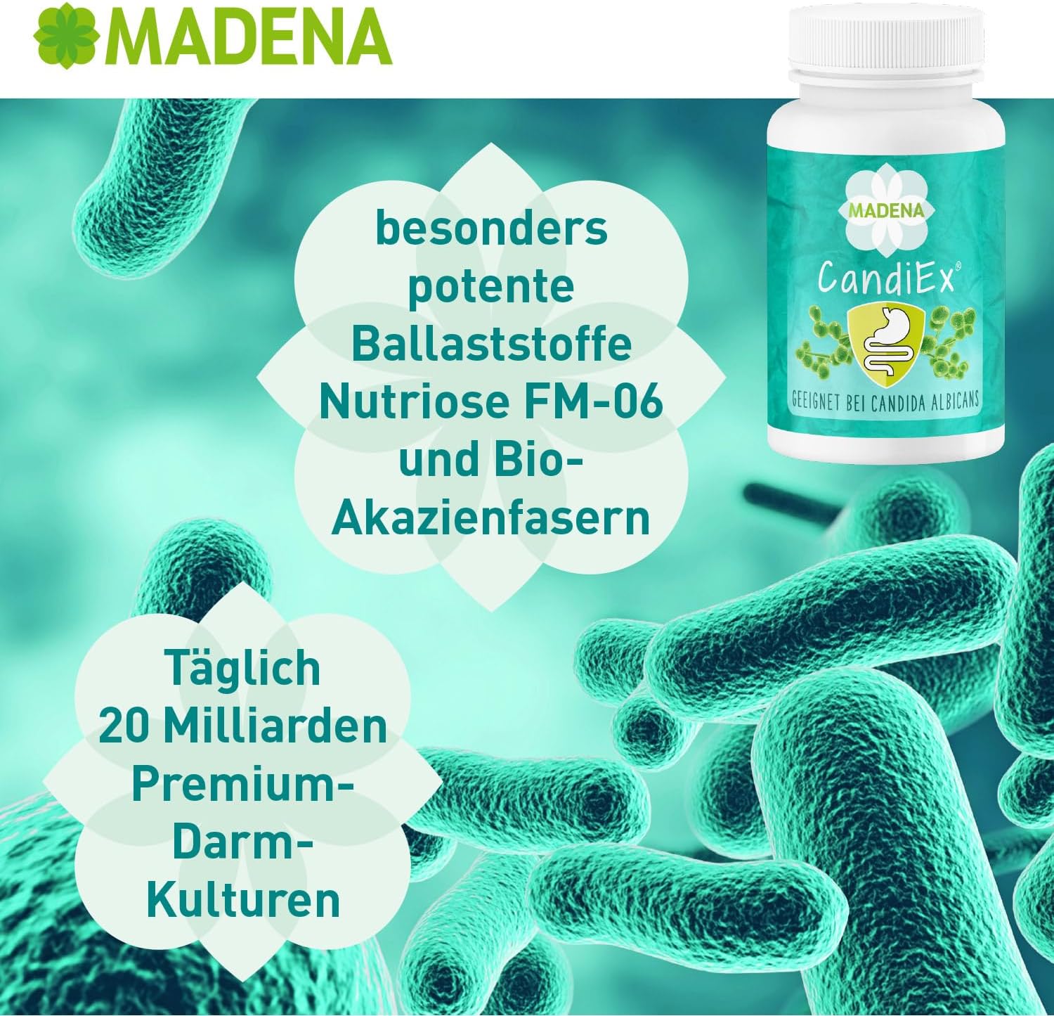 Madena CandiEx is een voedingssupplement met 9 geselecteerde, genstabiele en reproductieve darmbacteriestammen in een dagelijkse dosering van 20 miljard ziektekiemen. Door de twee bijzonder krachtige voedingsvezels Nutriose FM-06 en biologische acaciavezels krijgen de bacteriestammen optimale omstandigheden om zich te vermenigvuldigen en zich op langere termijn te vestigen.